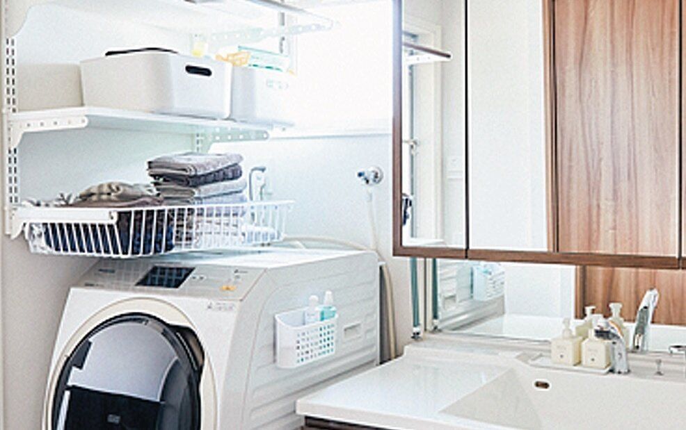家族がとにかくよく使うから、タオルはワンアクション収納に。かごを洗濯機の近くに置けば、しまうのもラク。