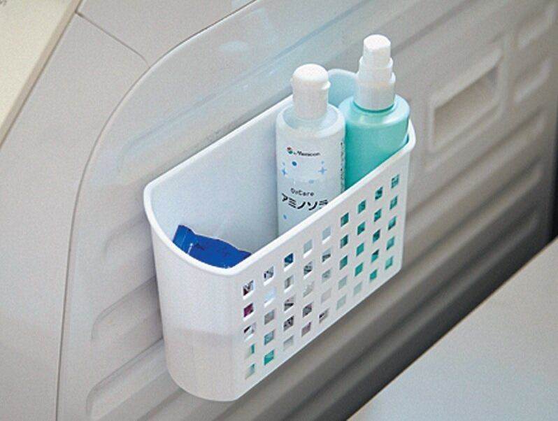 コンタクトの洗浄液やヘアケア用品など、鏡裏収納だと「使って放置」が常なので、いっそ出しっ放しに。洗面台横にある洗濯機の側面にペタッと貼れば、ノールックで戻せます。