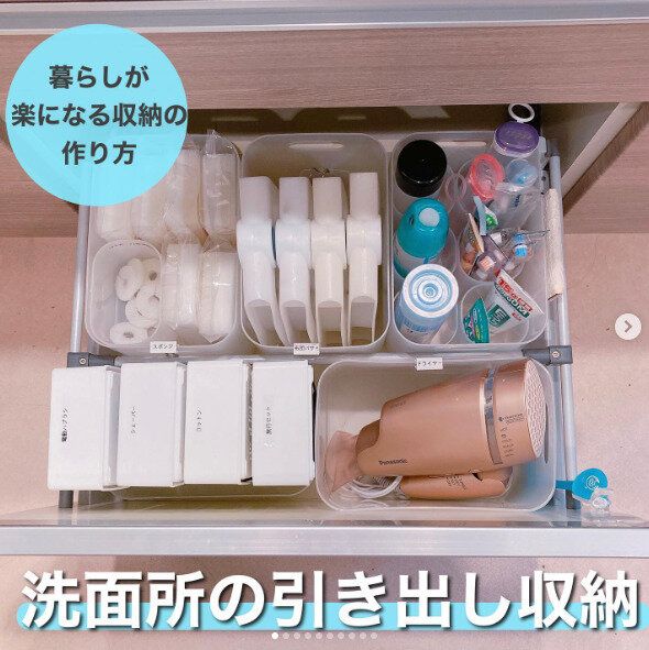 こちらは、洗面台の引き出しに収納ボックスを入れて、その中にドライヤーを収納している例です。種類ごとに分けているので、とても取り出しやすそうですね。引き出し収納は立てる方が見やすく、きれいに整います。