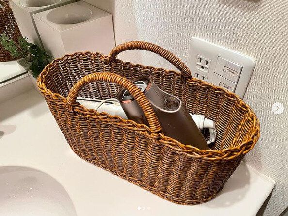 こちらはおしゃれなバスケットにドライヤーを収納している例です。ヘアアイロンなどもいっしょに入れることができ、収納スペースもしっかりありますね。取り出しやすそう!