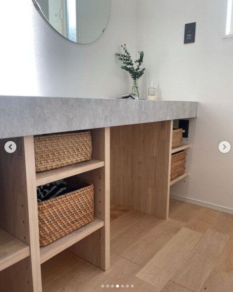 おしゃれなカゴの中に、ドライヤーやブラシもまとめてイン。洗面所のコンセント横スペースを活用した素敵なアイデアで、使いやすく取り出しもしやすそうですね。カゴを置くことでコンセントも隠せるため、洗面所まわりをスッキリ見せたいときにおすすめです。