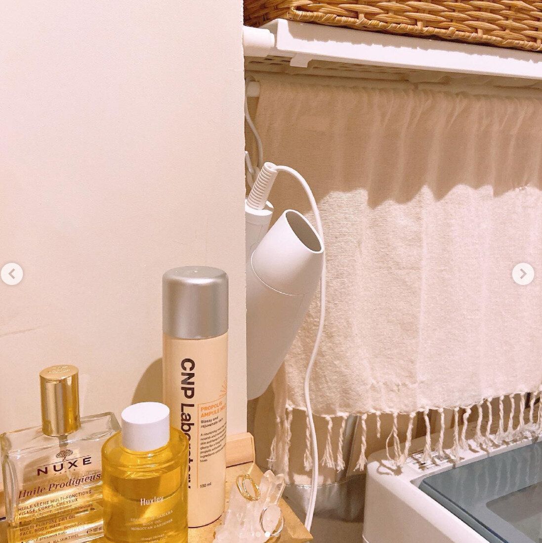 おしゃれなデザインのお気に入りのドライヤーは、フックで吊るして見せる収納にするのもおすすめです!こちらはダイソーのS字フックを活用したアイデアで、ホワイトのシンプルなデザインのドライヤーが周囲のアイテムともマッチしています!プチプラで取り入れやすいところも◎です!