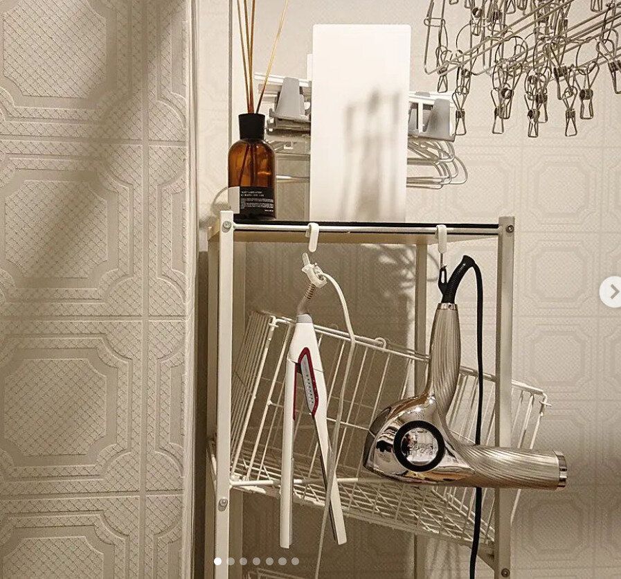 洗面所に置く棚の1スペースをドライヤーとヘアアイロン専用置き場に!柵があるため、ドライヤーが落ちる心配もなく保管できます。取り出しやすさ重視で使いやすい収納になっていますね。棚に余裕があるという人は、ぜひ試してみてはいかがでしょうか。