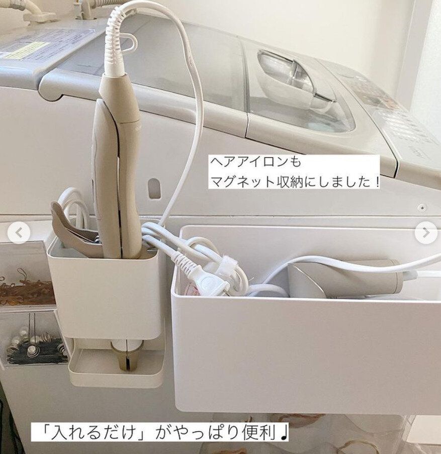 洗濯機横の空きスペースは、マグネット収納が大活躍!ヘアアイロンやドライヤーをすっぽり収納できるケースを使えば、このように『入れるだけ』の便利で楽ちんな収納が完成しますよ。収納ケースを洗濯機の色に合わせると、よりナチュラルにお部屋に馴染みます。