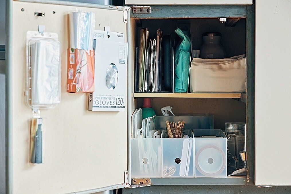 扉の裏が収納スペースに。フックを貼り付けてポリ袋やビニール手袋の箱を浮かす収納に変身!「扉を開けたら片手で引っ張るだけなのでラクです」。