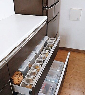 冷蔵庫横の引き出し2段は全てお菓子や乾物などの食材を収納。1カ所に食材を集めることで食べ忘れを防止。乾物の容器は透明にして中身がすぐ分かるように。