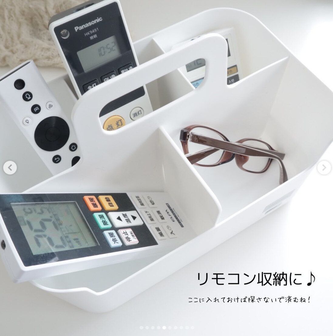 ニトリの『ハコブNインボックス』は、やさしい丸みのついた持ち手つきで、出し入れしやすいデザイン。仕分けしやすい仕切りも便利な人気アイテムです!値段は599円で、リモコンをまとめておけば探す手間も省けます。リモコンのほか、文房具やコスメ収納など幅広く使えますよ。