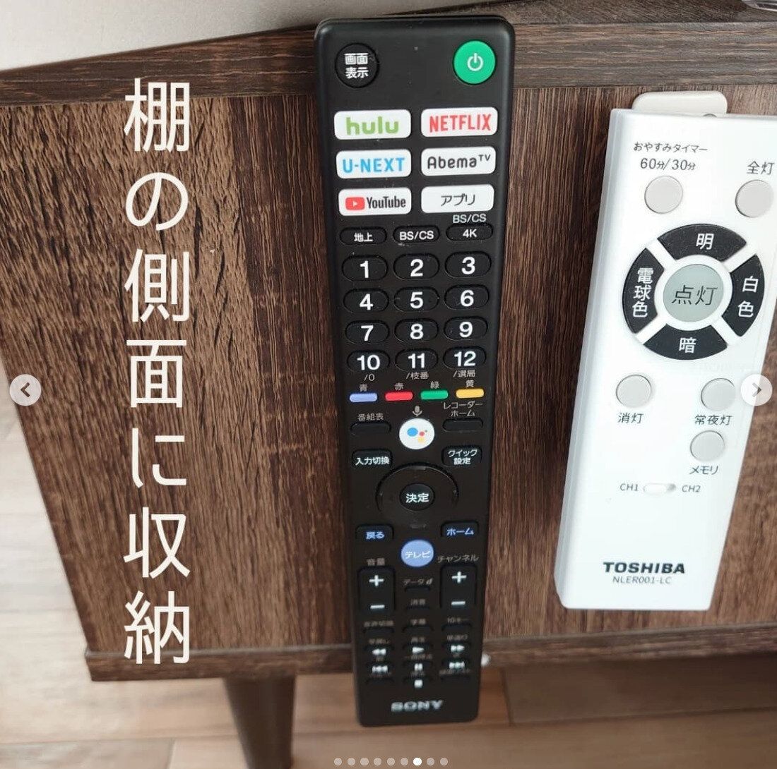 家庭にはテレビだけではなく、電気やエアコンなどさまざまなリモコンがありますよね。そんなすべてのリモコンの定位置を1ヵ所にまとめることで「どこに行った?」と探す手間が省けます。壁にとりつける収納にしておけば、特別収納スペースを設ける必要もなくなりますよ。