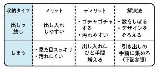 キッチンツールの収納には2つのタイプが。「出しっ放し」は取りやすいけど見た目がゴチャつくので、デザインを統一して数をしぼると◎。「しまう」とスッキリしますが、出し入れに手間がかかるのでPOINT4を参考に引き出しの収納を工夫してみて。