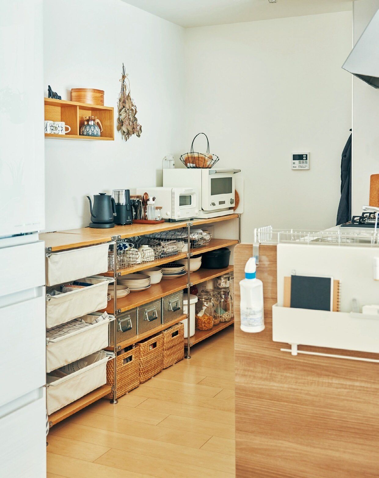 ワイヤータイプなら、下の棚板が見えるから引き出しすぎて落ちるのを防げます。浅いバスケットを選んでいるので手前にある物は引き出さなくても取り出せて、さらにラク。