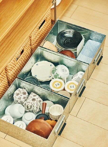 毎日使う食器はほこりをかぶる暇もないくらいに使うからバスケット収納でも問題ないですが、予備の器や来客用の2軍食器はふた付きボックスに。中が見えないからすっきり!