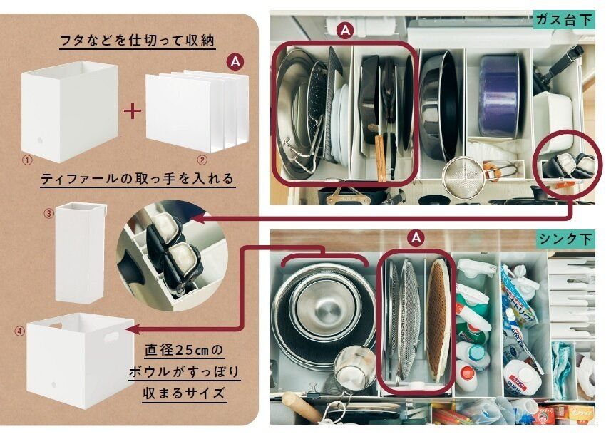 引き出しの中はできるだけ立ててワンアクションで取り出せるようにしたいもの。まずはボックスで大きくスペースを区切り、フタ、ざる、取っ手の収納場所には仕切りをプラス。隣の物が引っかからず、気持ちよく取り出せます。