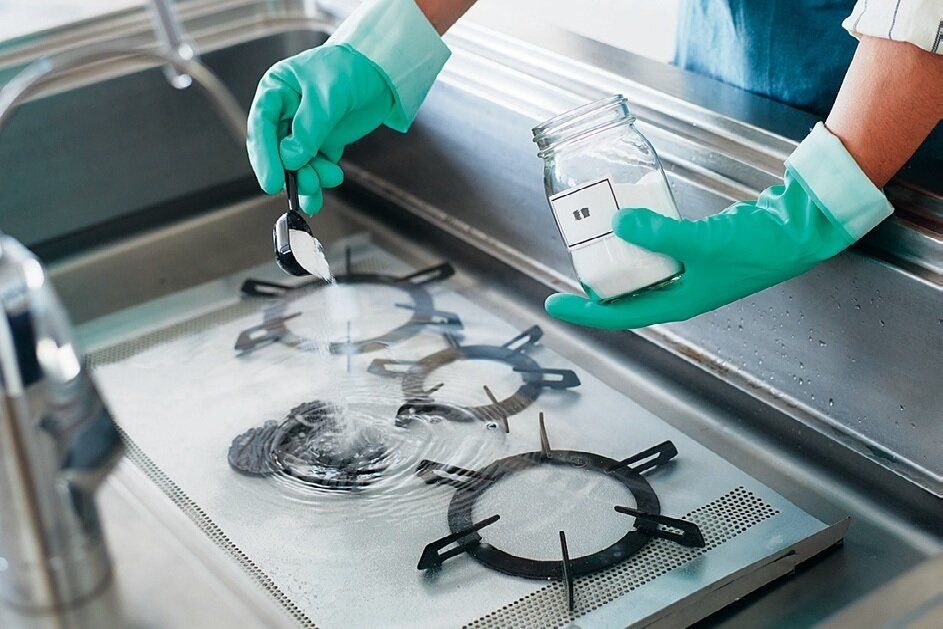 換気扇フィルター、コンロの五徳、バーナーキャップなどのパーツを、排水口に栓をしたシンクか、大きめの容器に入れる。50~60℃のお湯をはり、汚れている部分が隠れるくらいたっぷりと重曹をふりかける。汚れがひどい場合は、お湯の温度を上げる。