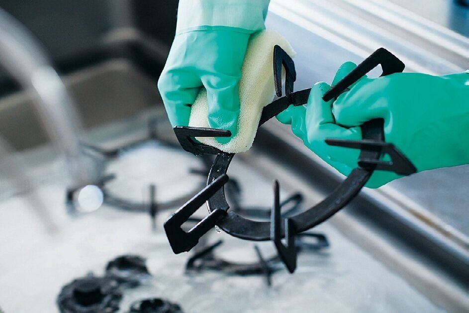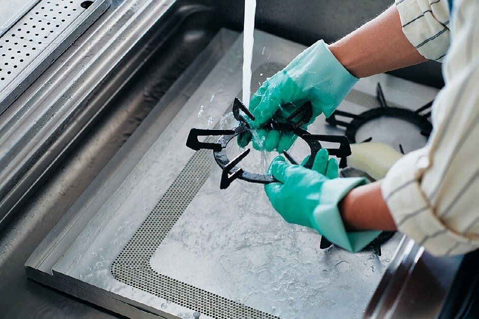 換気扇フィルターや五徳などのパーツをスポンジでこすり洗いして汚れを落とす。