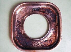コンロの汁受けにびっしりついていた焦げがほぼキレイになり、輝きが復活。重曹をふりかけたら勝手に焦げが浮き上がってきて、30分後にスポンジでこすったら、スルン!