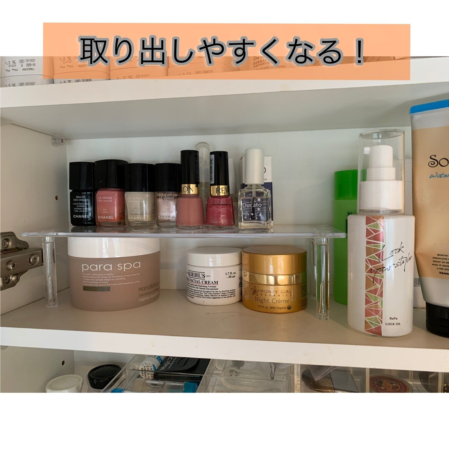 セリアのディスプレイスタンドを置くことで、奥の方に追いやられてしまっていたモノや、重ねて収納していたモノが棚を作ることで取り出しやすくなりました。また、ムダなスペースがなくなり収納力も上がりますね!