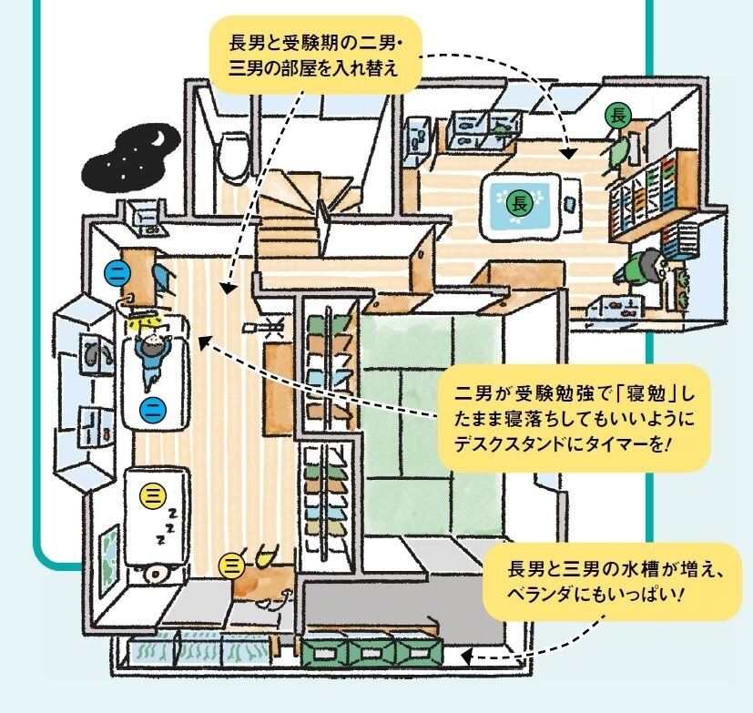 長男が10歳のときに個室を与え、三男の小学校入学を機に、全員が自分の部屋(二男・三男は同じ部屋)を持つように。それぞれの成長に合わせて、部屋の移動や家具の配置を変えることで居心地のよい空間に。本棚や望遠鏡、水槽など「体験から学ぶ」環境もバッチリ! 兄弟間で勉強を教え合うことも。