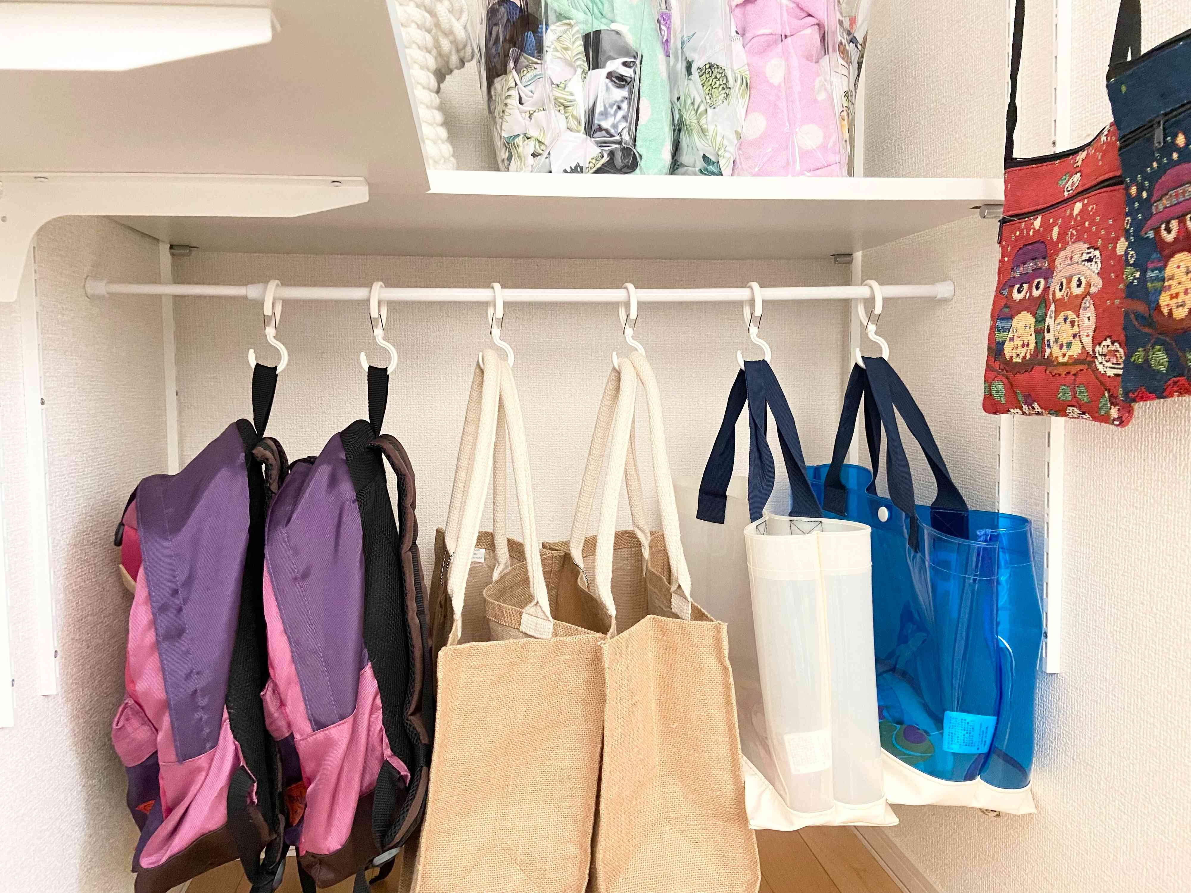 鞄は重ねておくと下にあるものが認識しづらくまた使いにくくなりますし、形も変形してくるので吊るす収納がオススメ。そんな鞄の吊るし収納に役立つのが「つっぱり棒」です。