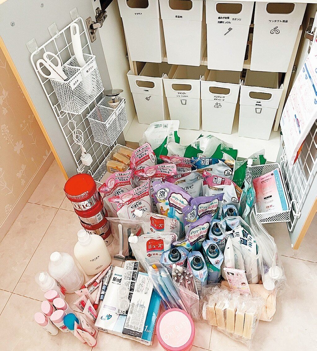洗剤や歯ブラシ、石けんなどは1年分のストックを年末にまとめて購入し、扉の中に収納。「空間をフル活用&迷わず取り出せるよう、100均のファイルボックスに1~2種類ごとに収納。扉の内側にもワイヤーネットで収納を追加し、比較的よく使うパックなどの定位置に。右利きなので、右側により多く使う物を置いています」。