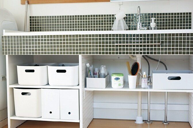 収納ボックスを白で統一することで、クリーンな印象に。「物を入れすぎないようにすれば、中身をラベリングしなくてもOK。洗面台下の床の上には何も置かないことで、サッとほこりを掃除できるようにしています」。