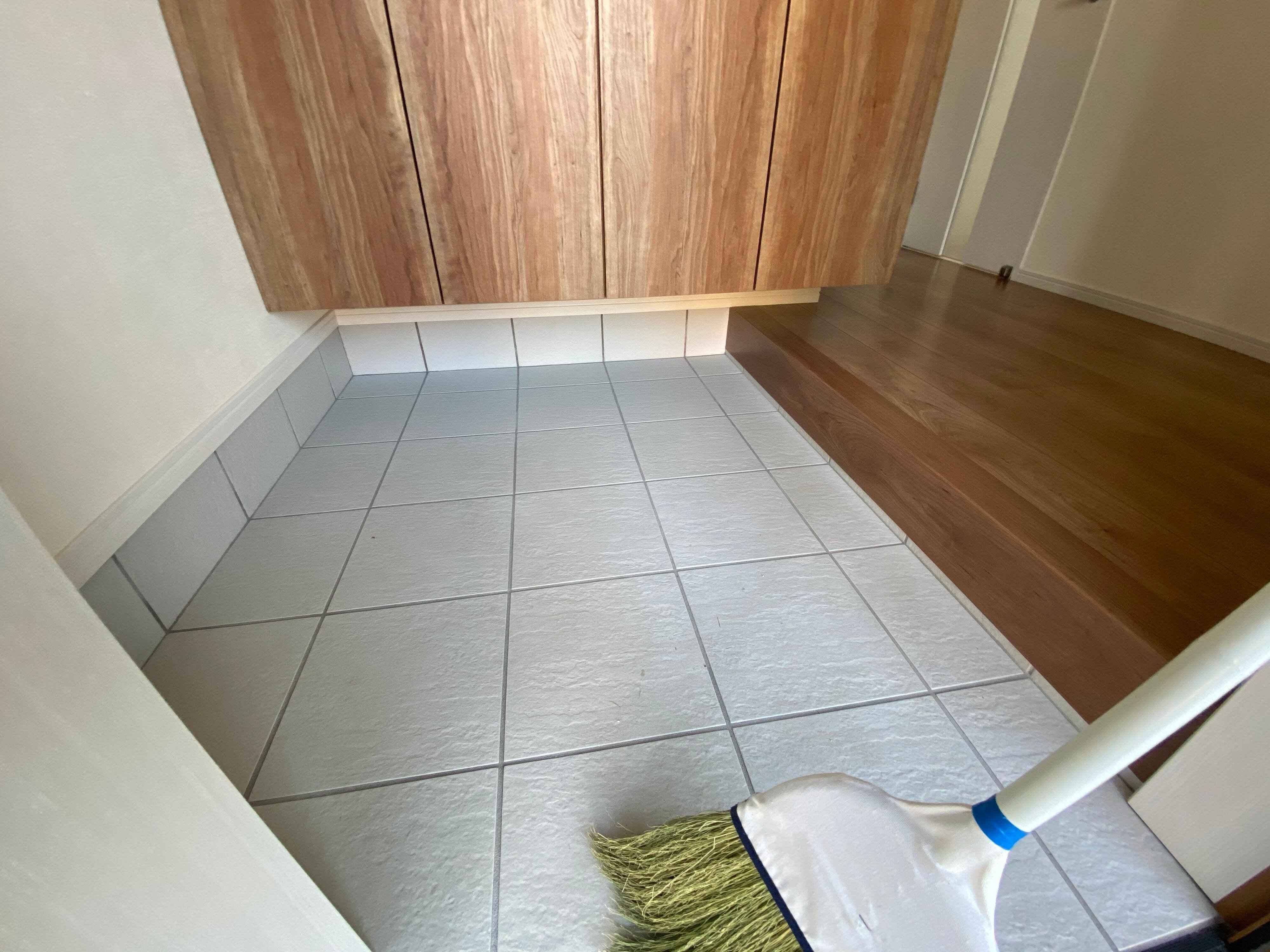 まずはほうきでゴミを掃き出しておきます。ブラッシングスポンジに少し水を含ませ、玄関タイルをこすって汚れを浮かせます。そうしたらすぐに古タオルで水分を拭き取り、終了です。