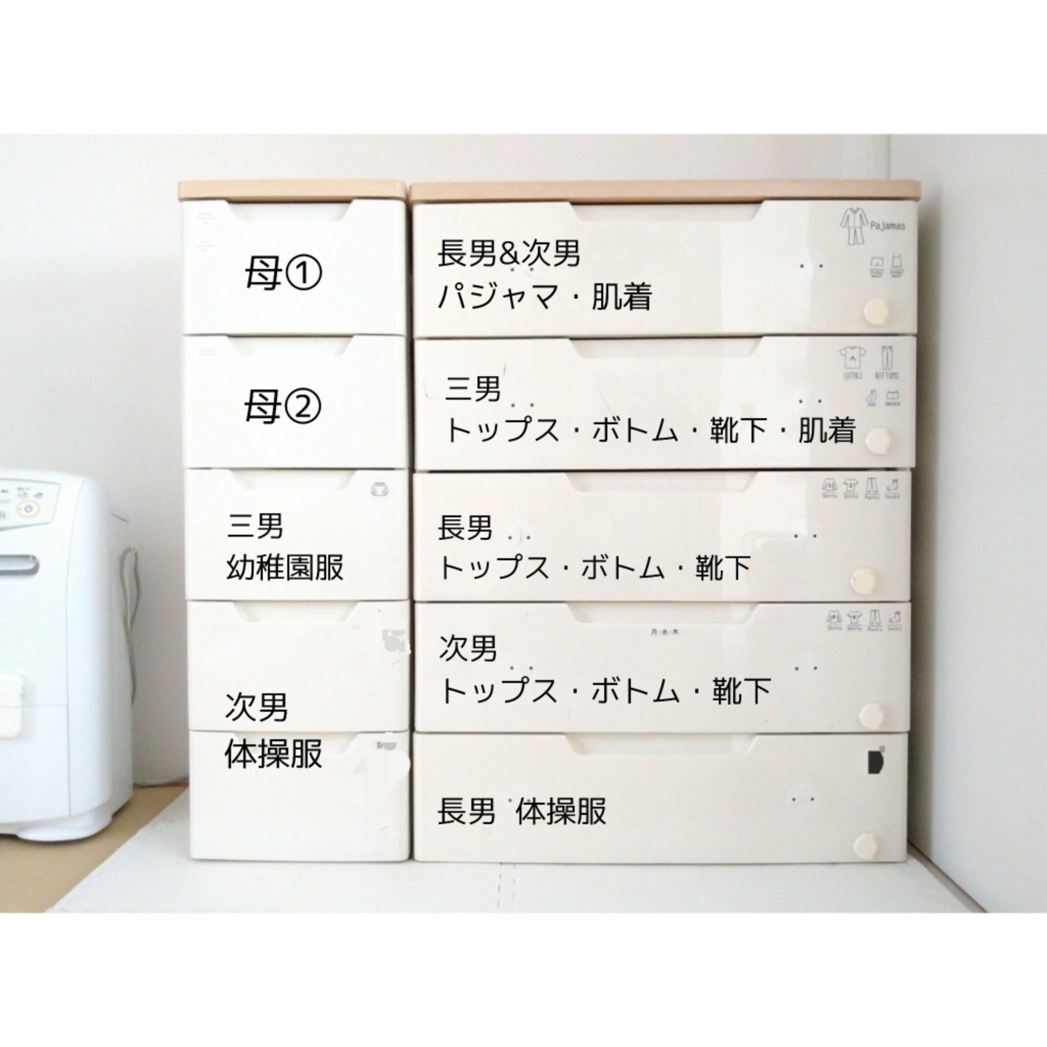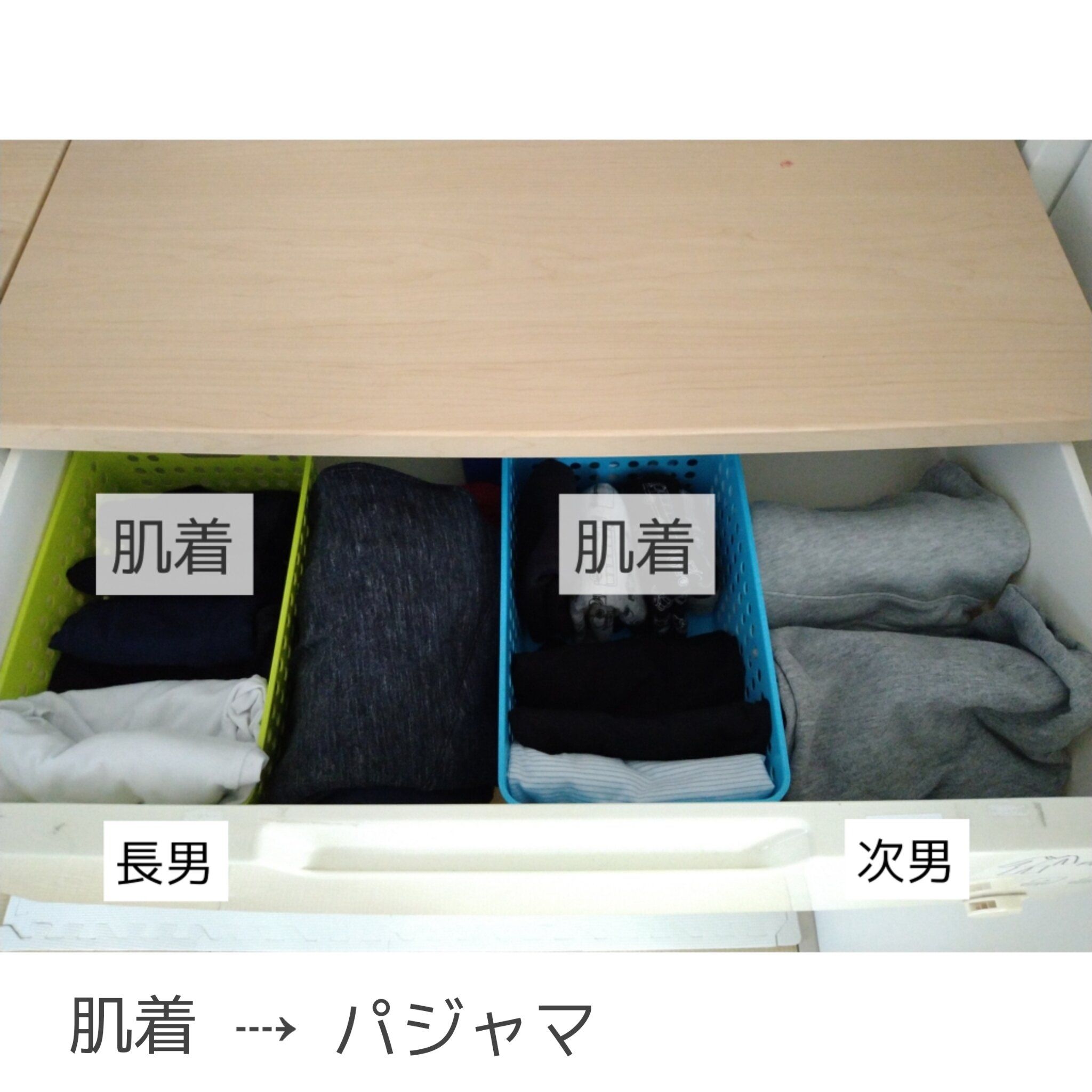 あちこち引出しを開け閉めすることがないように「普段着グループ」、「パジャマ・肌着グループ」、「学校や幼稚園の服グループ」と引出し1つずつ兄弟分グループ分けしました。