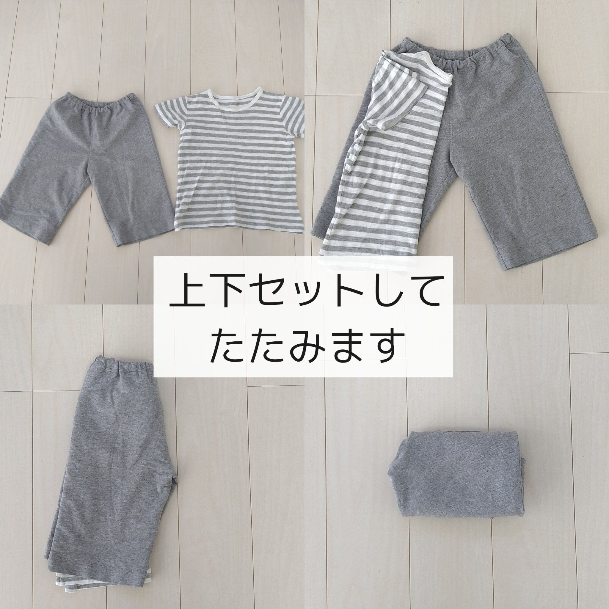 パジャマと体操服は上下セットにしてたたんでいます。引出しを開けてガバっと掴めば全て取り出せるのでアレがない、コレがないとヘルプ要請がなくなるのでイライラが1つ減らせました。