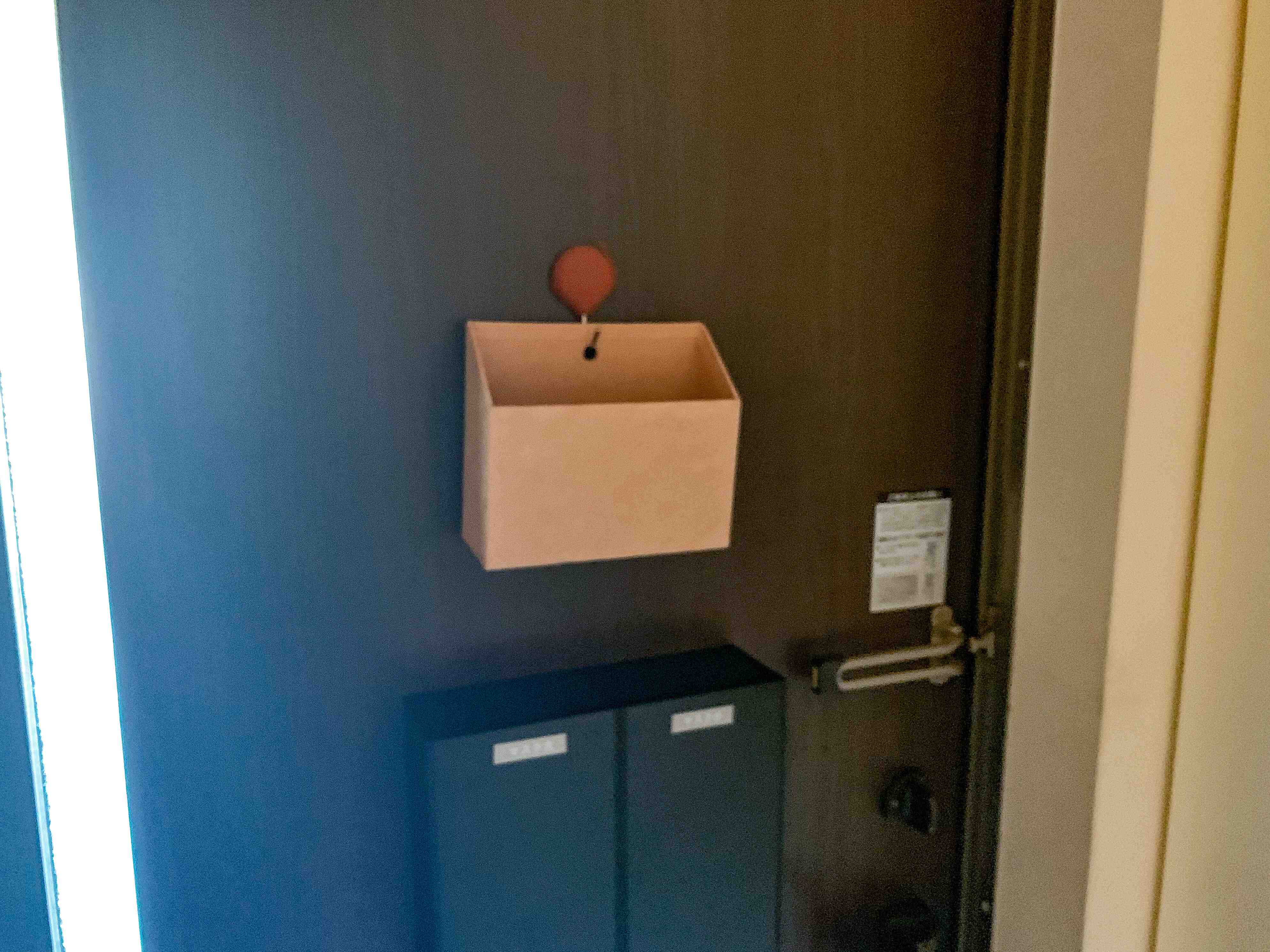 そこで、玄関ドアに、投函する郵便物を入れるボックスを、マグネットフックで吊り下げておくようにしました。