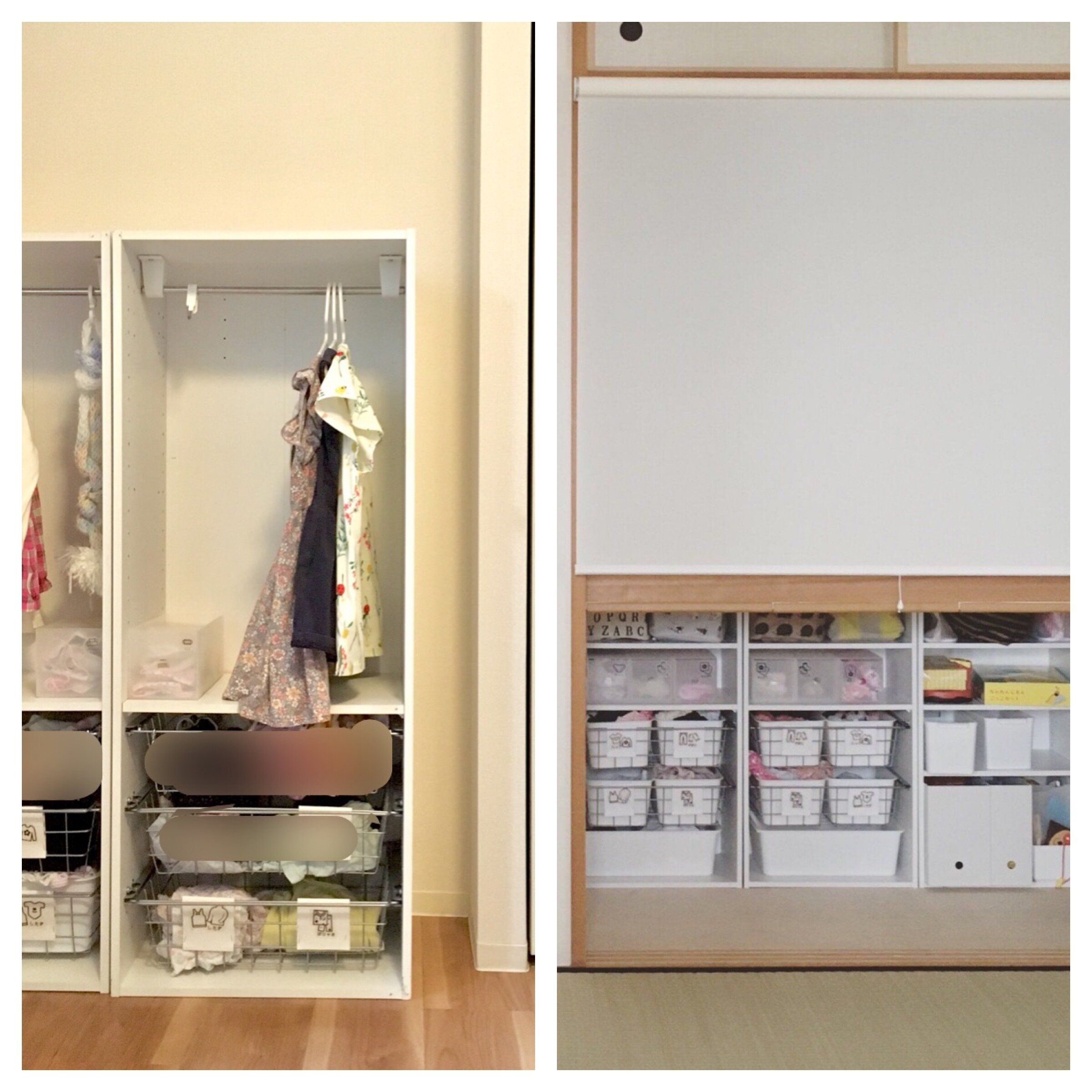 特に子どもの収納におすすめなのがニトリのカラボシリーズです。棚板の追加や引き出しなどの付属パーツの種類が多く、子どもの成長に合わせて必要な形に組み替えられる点が便利で、洋服収納やおもちゃ収納に使っています。収納ケースなどシンデレラフィットするものが簡単に手に入るところもおすすめポイントです。