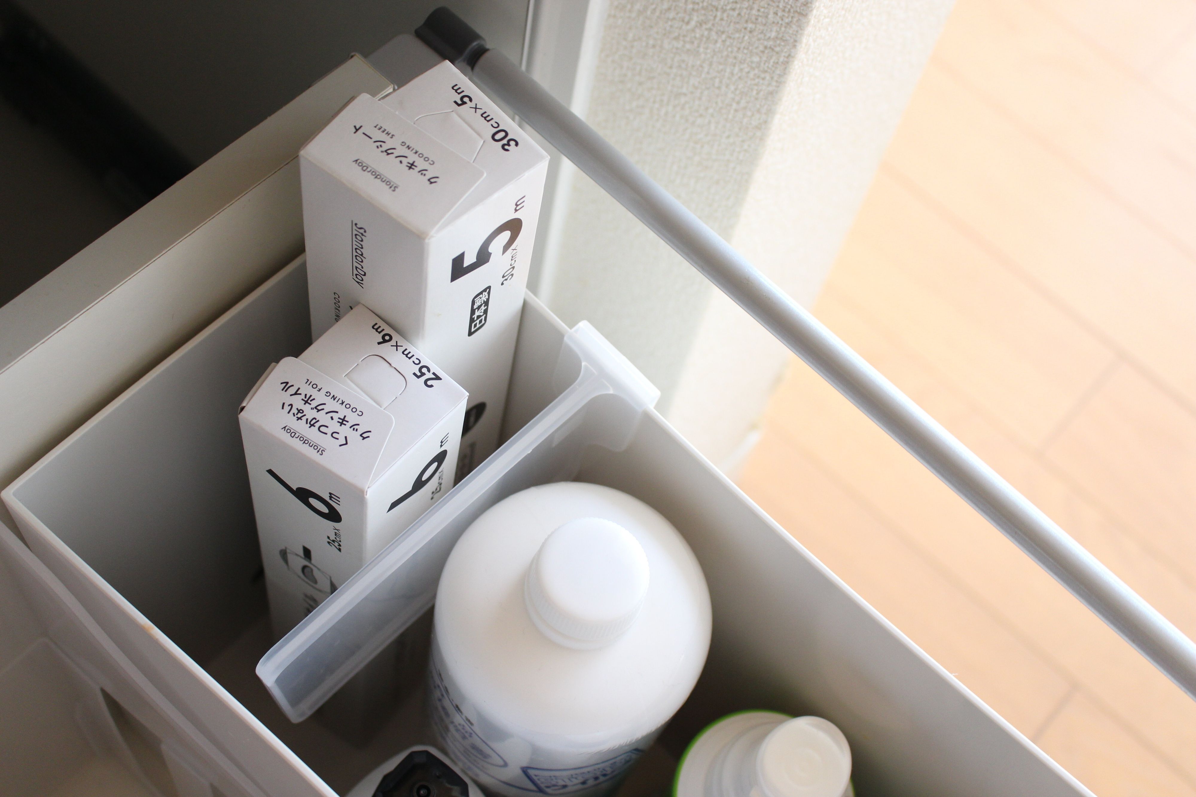 キッチンペーパーは、ここにピッタリ三個収まるので、必ずここに有るものが全て無くなったら購入するようにしています。ストックしておくにも収納する場所を決める事で、買いすぎ防止にも繋がっています。