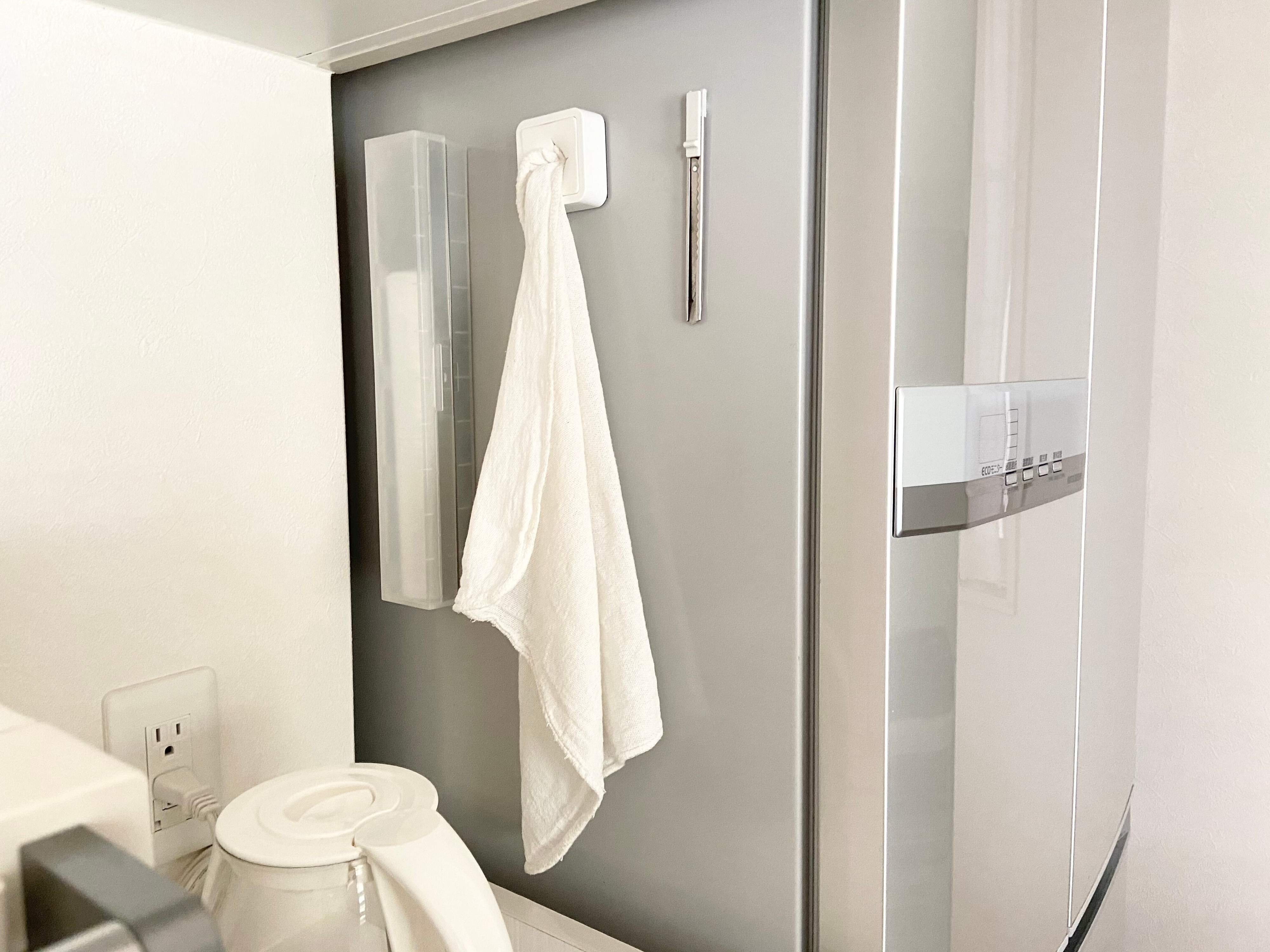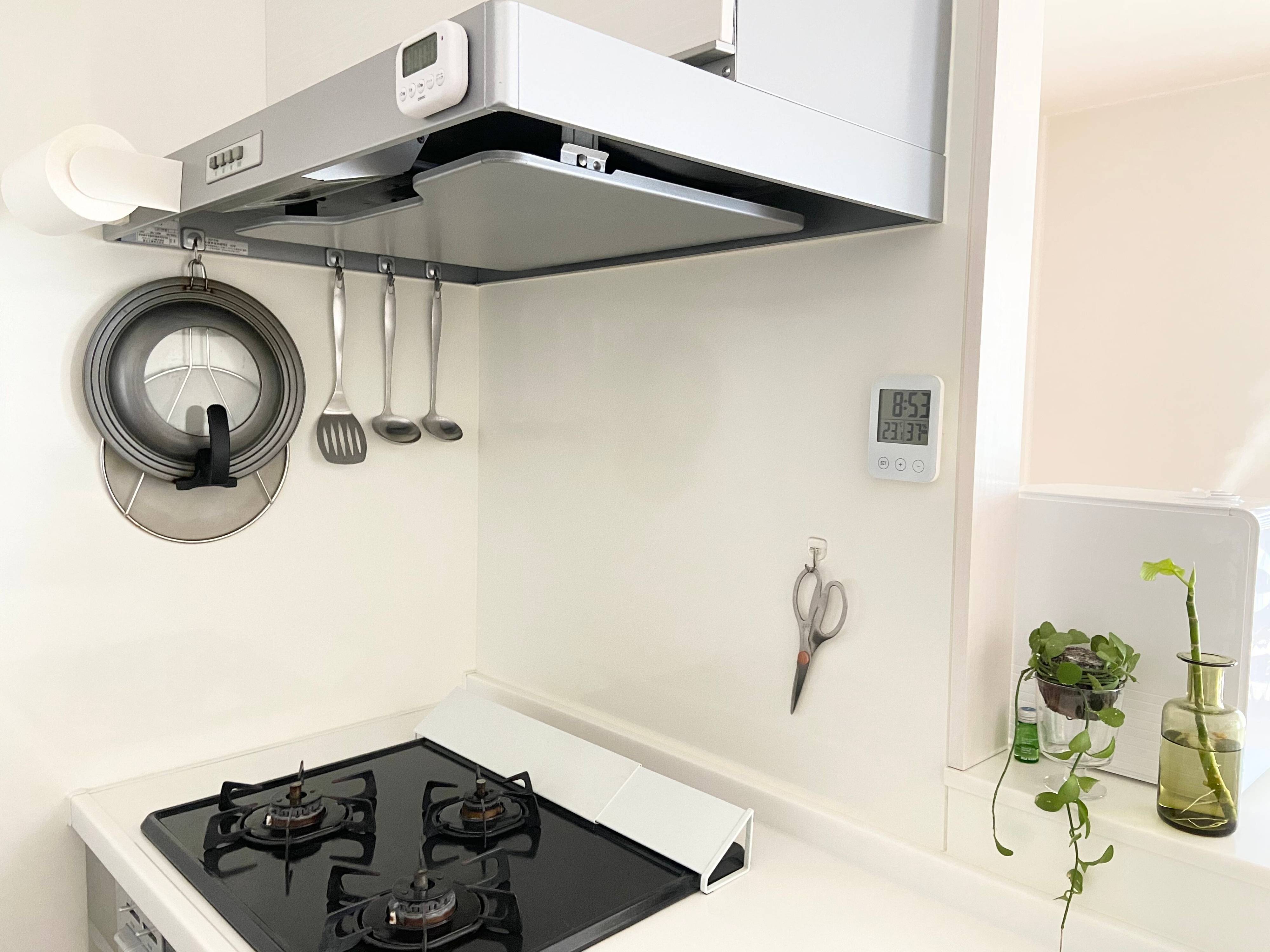 冷蔵庫の横、キッチン壁面、レンジフードなどの場所を利用して浮かし収納にすると見た目もスッキリして、モノを動かす必要がないので一石二鳥となります。