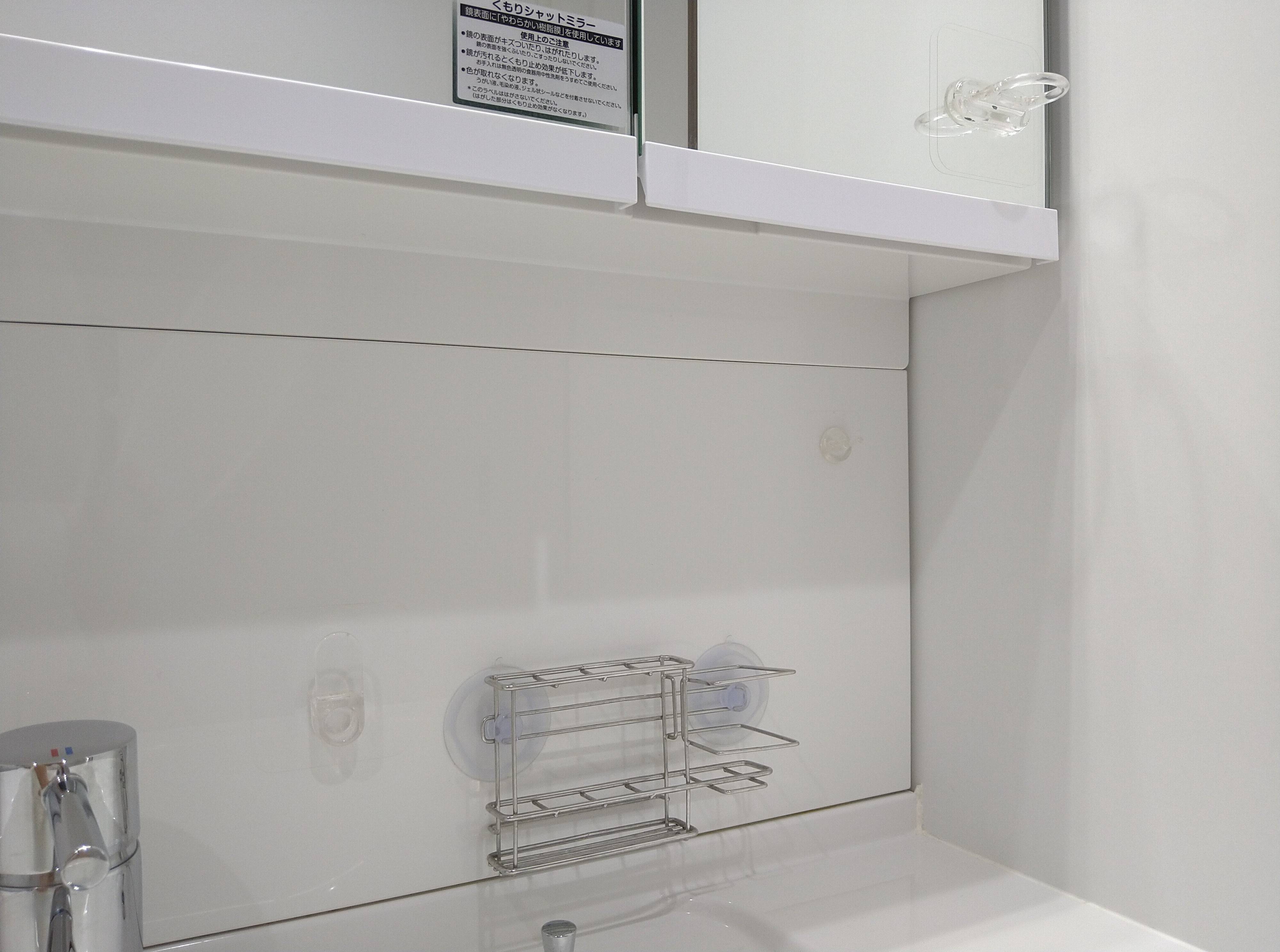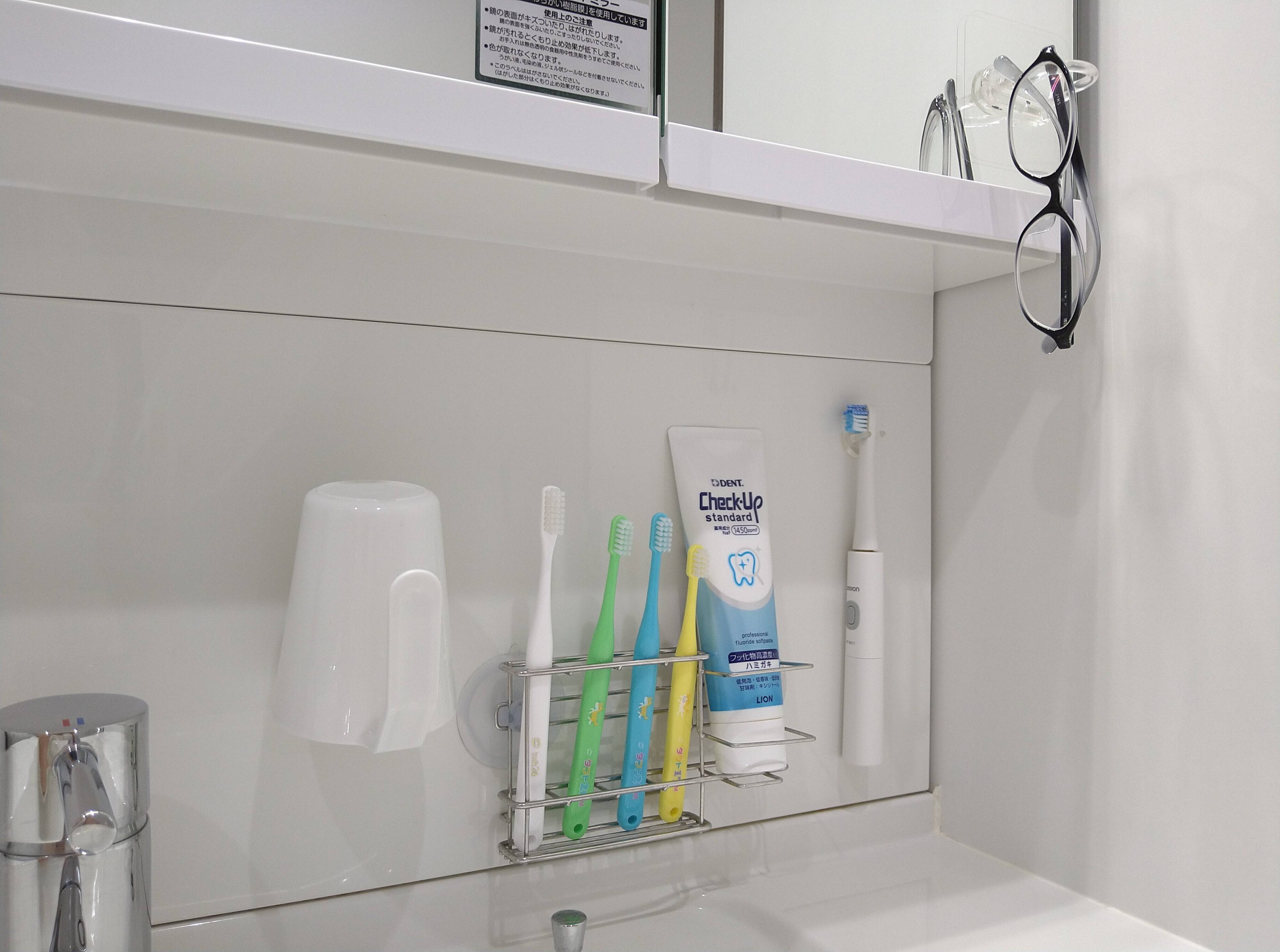 歯ブラシスタンドは吸盤タイプを夫の電動歯ブラシ、うがい用コップはセリアのフィルムフックを使用しました。