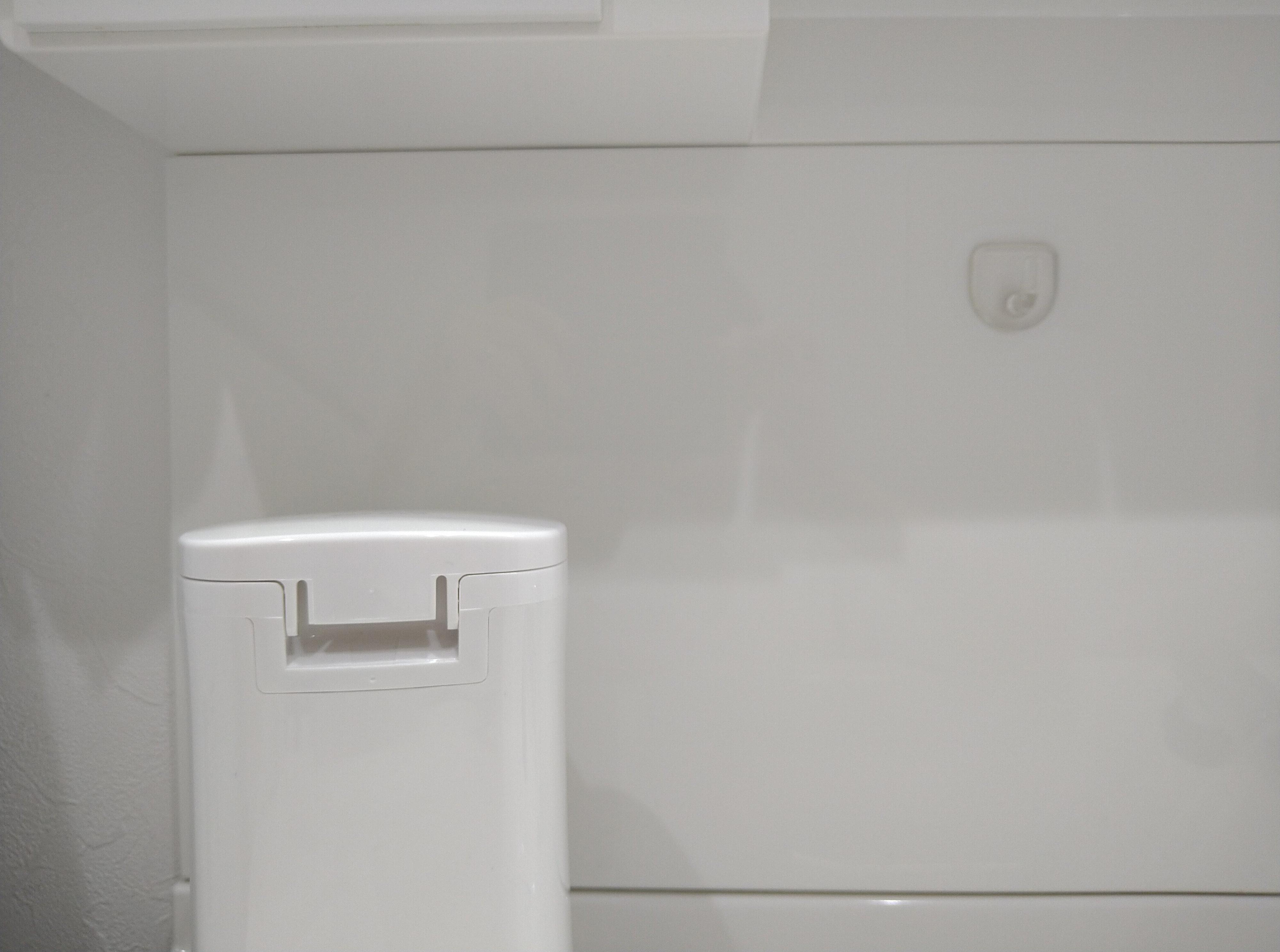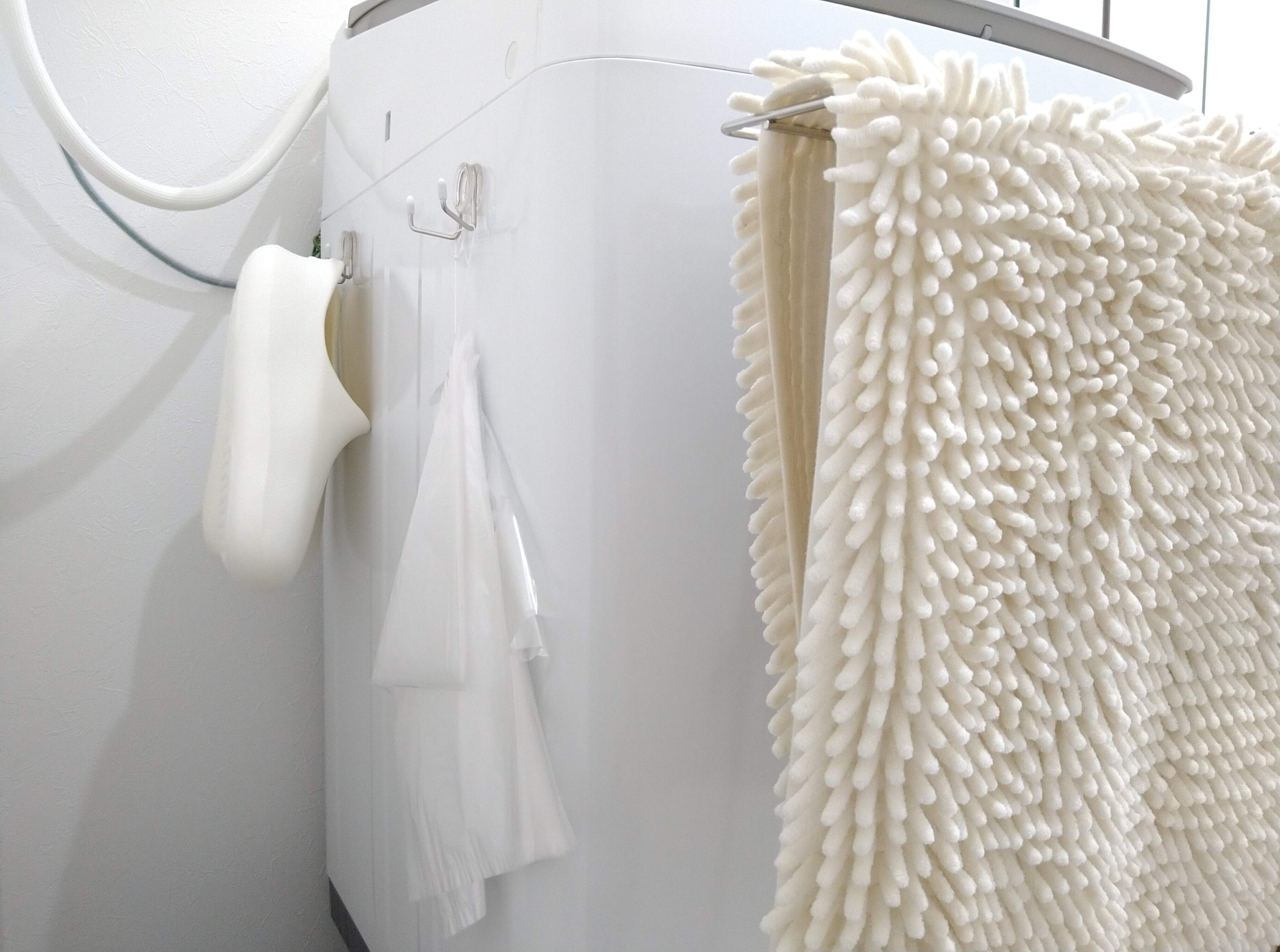 洗濯機横には吊り下げひもがついたポリ袋を引っ掛けて、お風呂の排水口ゴミや洗面所のゴミをすぐ回収できるようにしています。