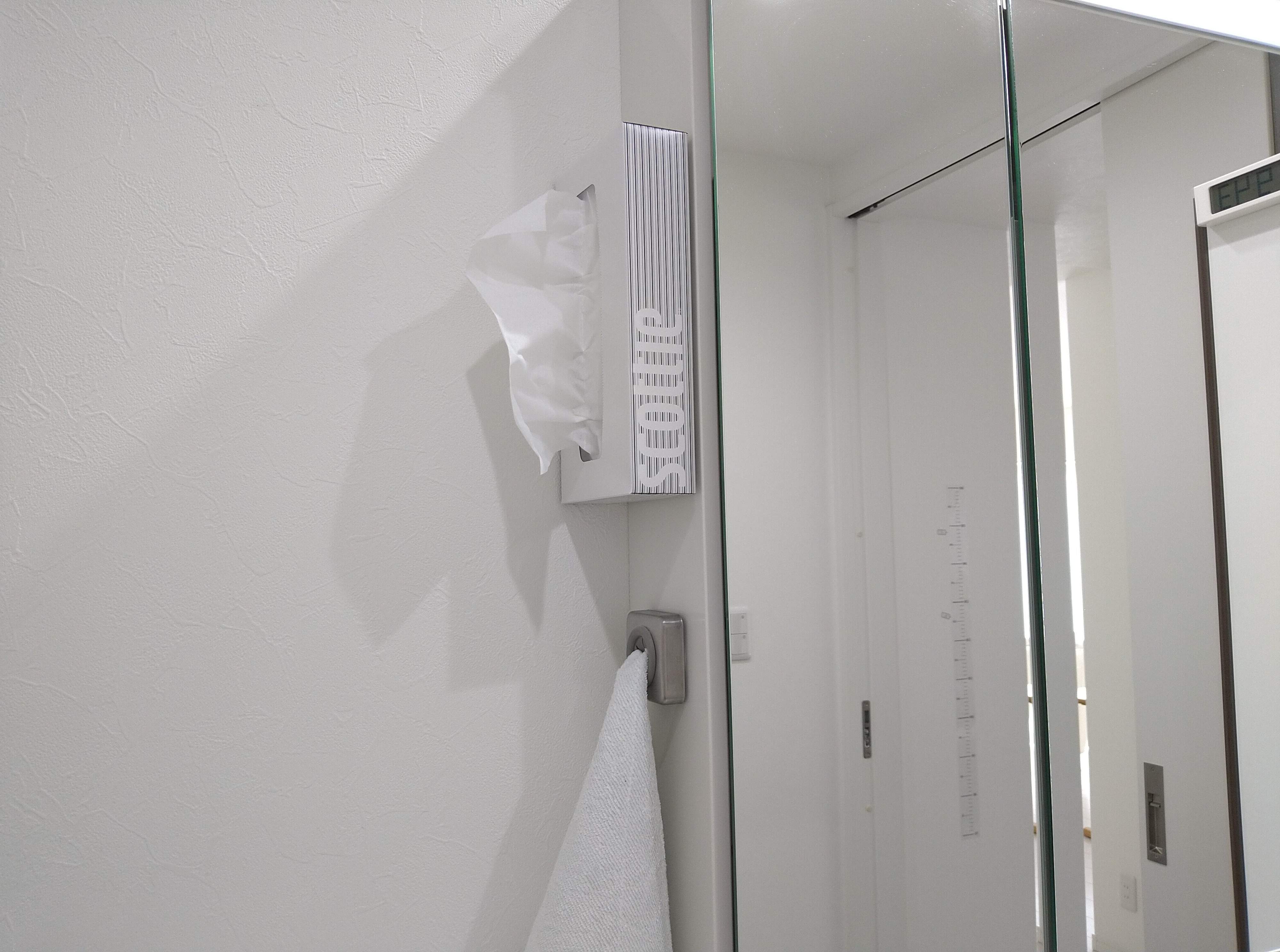 三面鏡横にセリアの「マグネット取り付けパネル」を貼り、専用のマグネットバーを取り付けてボックスティッシュも空中収納できました。