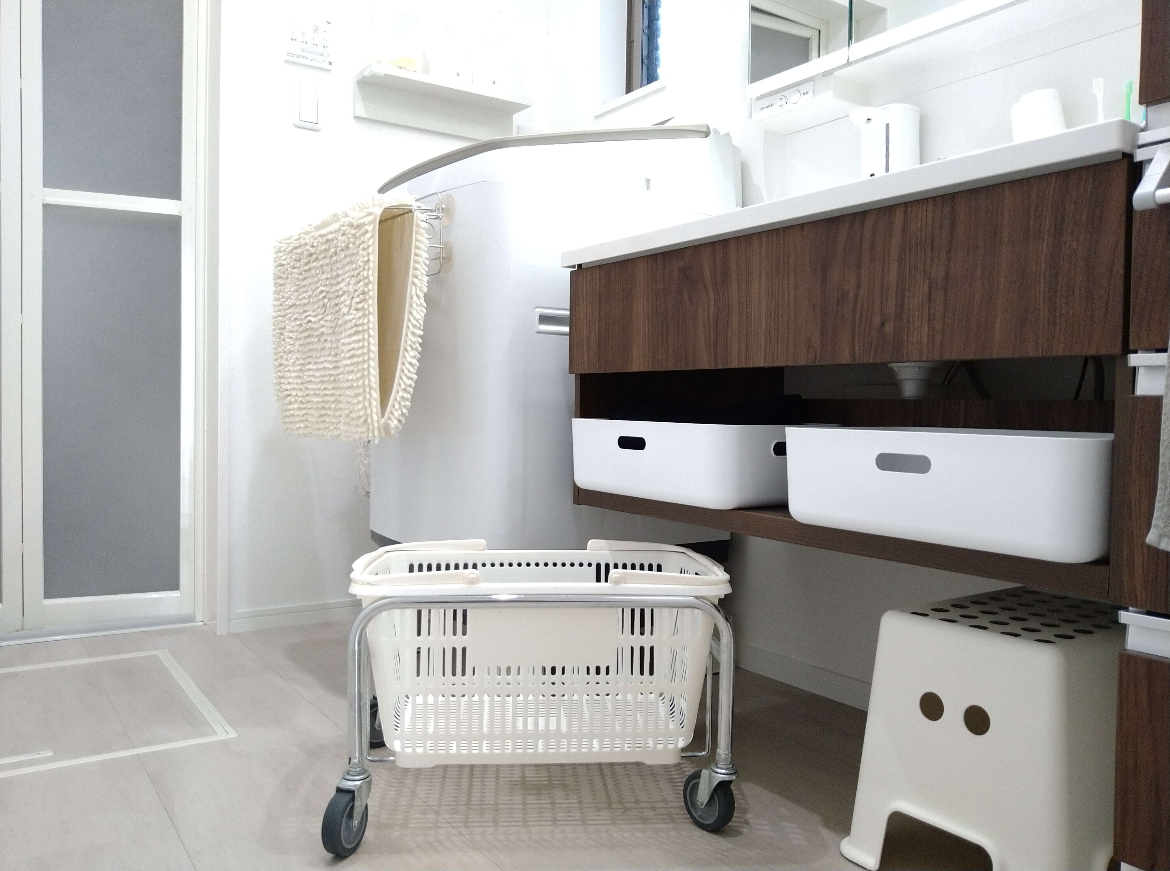 空中収納ではありませんが、掃除しやすさを考えてスーパーで見かけるものを参考に「レジかご」と「かご台車」をランドリーバスケットとして使っています。