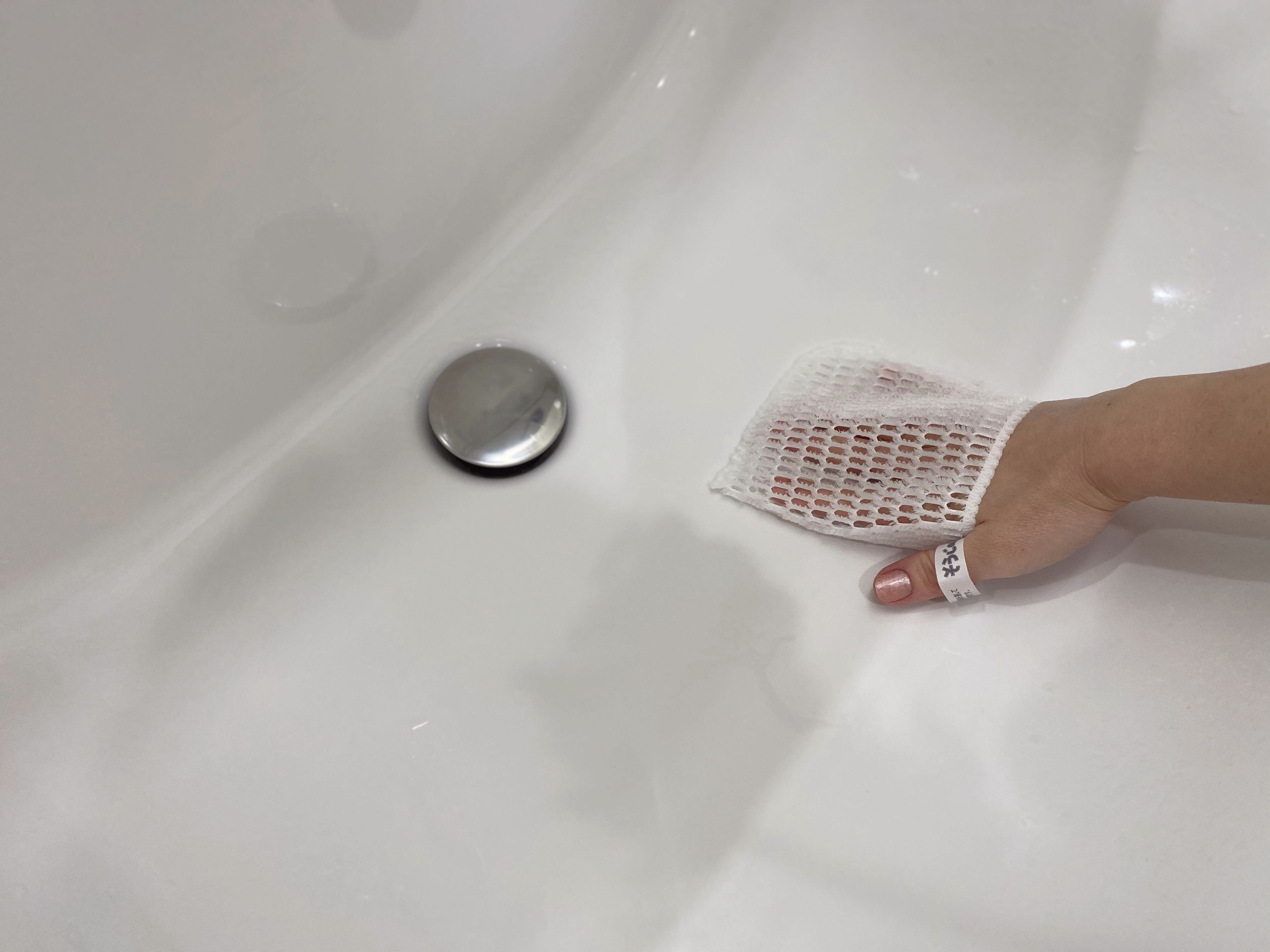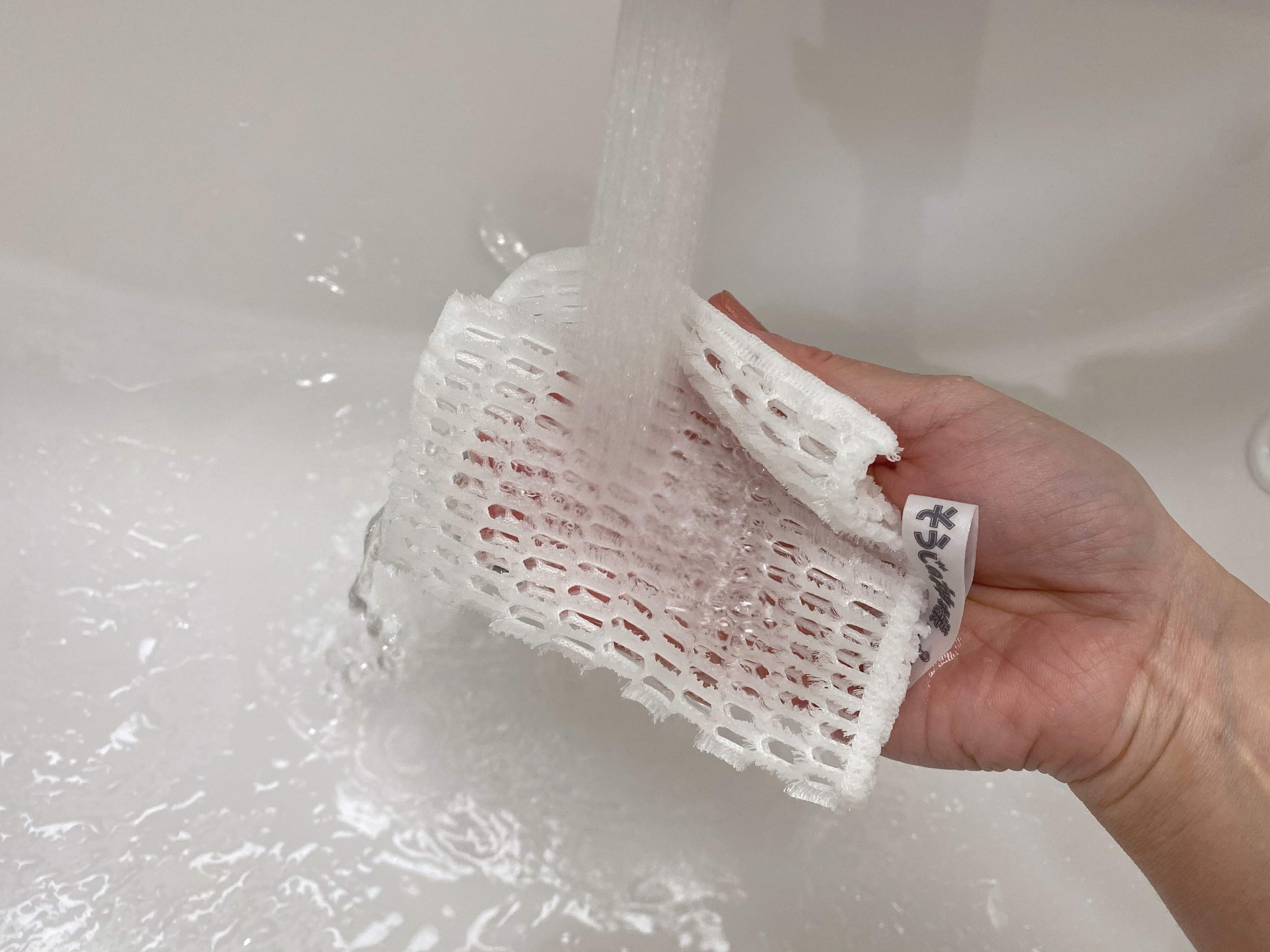 このあみたわしは「洗剤不要」と謳っているだけあって、洗面ボウルにお湯をかけてこするだけ!