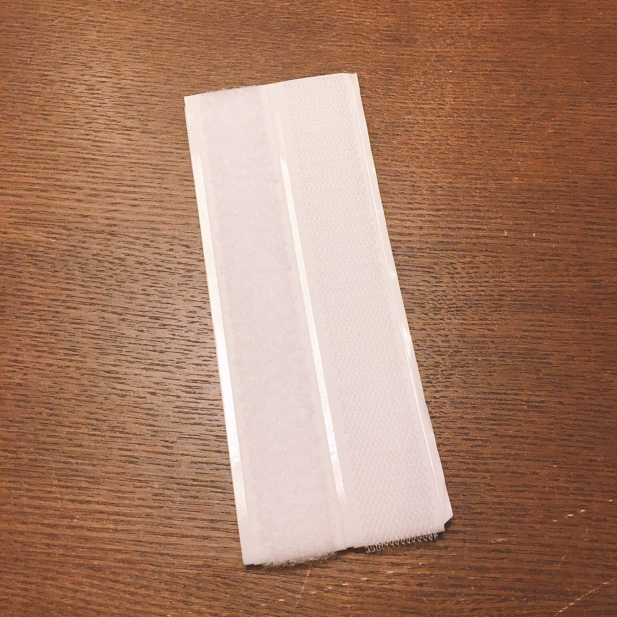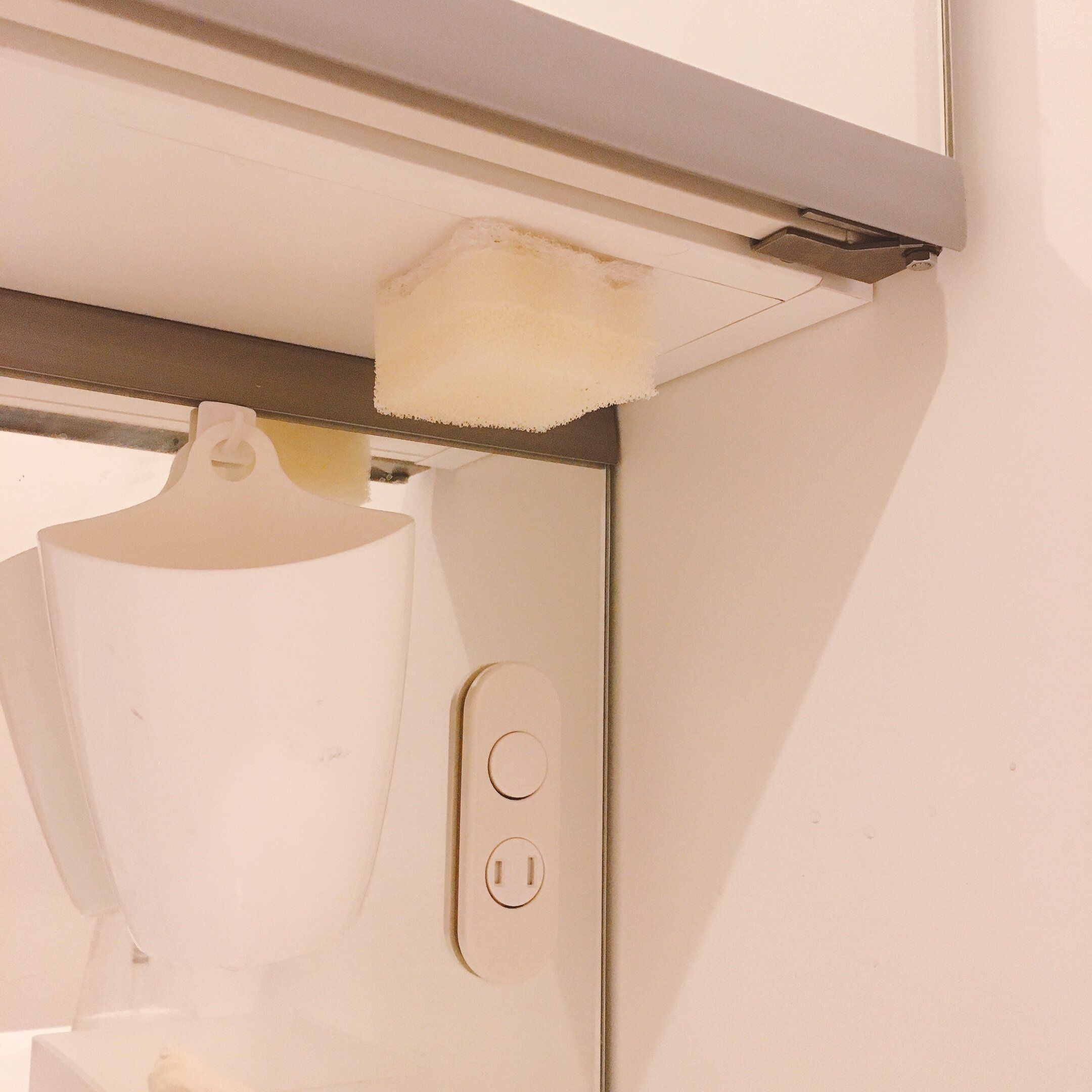 スポンジラックを置くと水でぬめってしまうのが嫌なのでスポンジラックは使っていません。ということでわたしは鏡の下の部分に貼り付けて収納しています。使うモノは裏がシールになっているマジックテープのみ。100均で売っています。そのザラザラした面を3×5cmぐらいに切ってスポンジを収納したいところに貼るだけ。