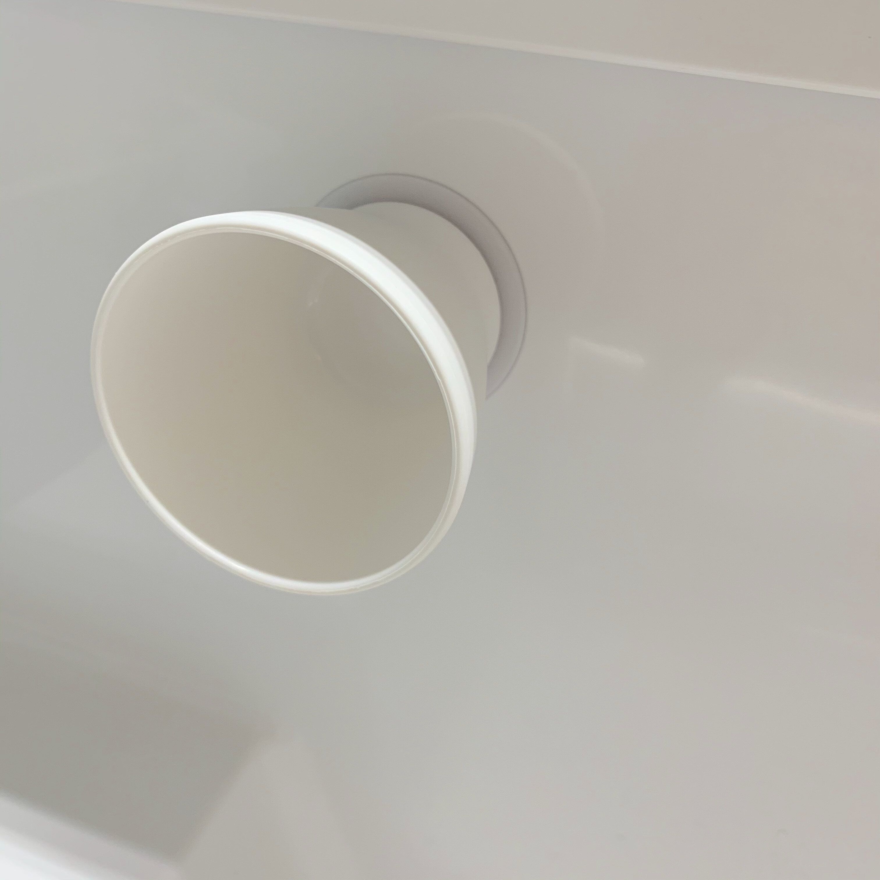 子どものうがい、歯磨き用のコップを浮かせました。このコップは吸盤で垂直につけられるようになっており、内側に水が溜まらず清潔に収納できます。もちろん、直置きしないのでコップの下にも水が溜まらずキレイを保てます。