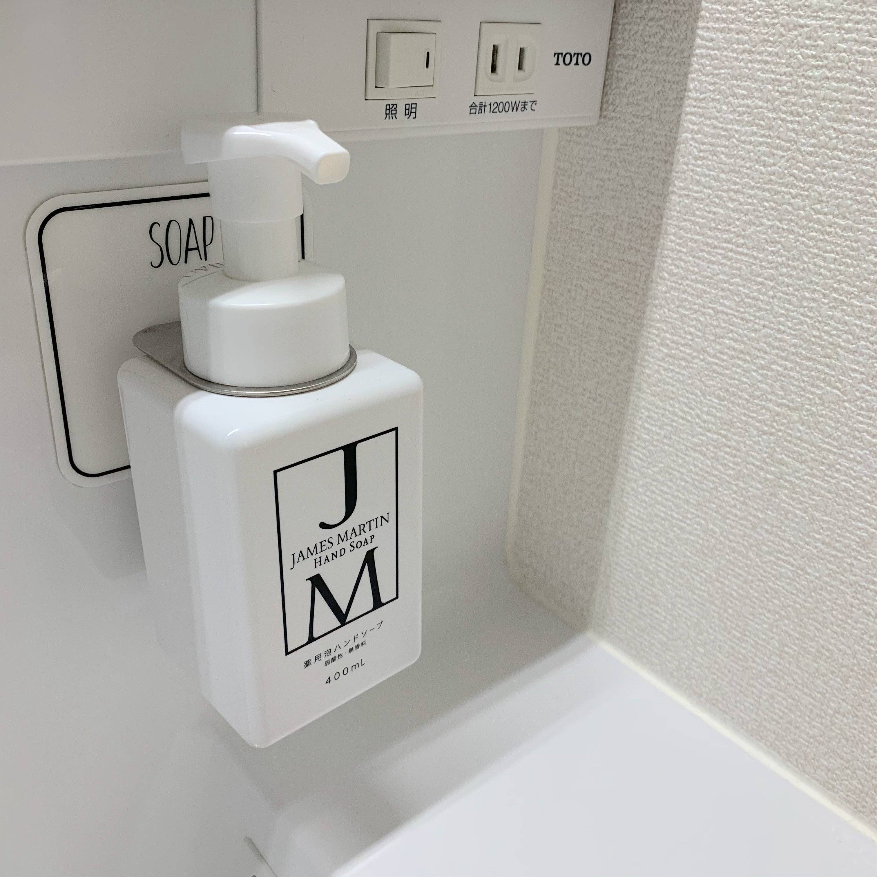 わが家では泡ハンドソープを使っています。泡ハンドソープ専用のホルダーを使って浮かせました。泡ハンドソープはプッシュするときにかなり力がいりますが、浮かせたままでもハンドソープを出すことができます。外れたり壊れたりすることもありません。