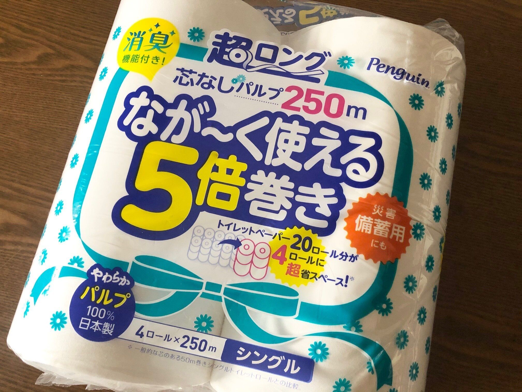 最近見つけた便利なトイレットペーパー、それは「なが~く使える5倍巻きトイレットペーパー」です。5倍巻きなので、4ロールで20ロール分使うことができる優れもの。なんと消臭機能まで付いていますよ。オープン価格ですが、私は近くのスーパーで489円で購入しました。ネットでも500円前後で購入できるようです。20ロール分ですから、決して高くもありませんよね。