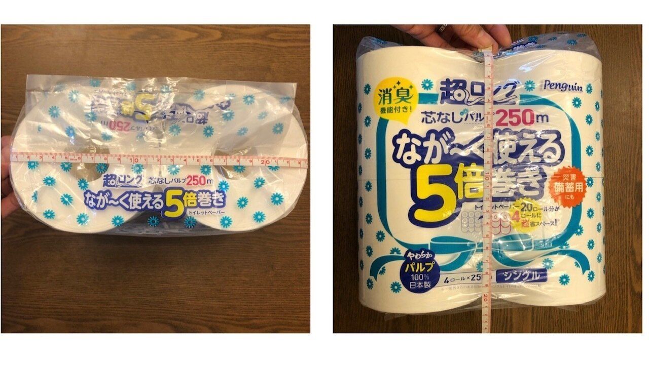 実は私は以前、2倍巻きトイレットペーパーを愛用していたのですが、それよりも更に更にコンパクトで、災害時の備蓄用に非常袋にも入れられるサイズですよ。