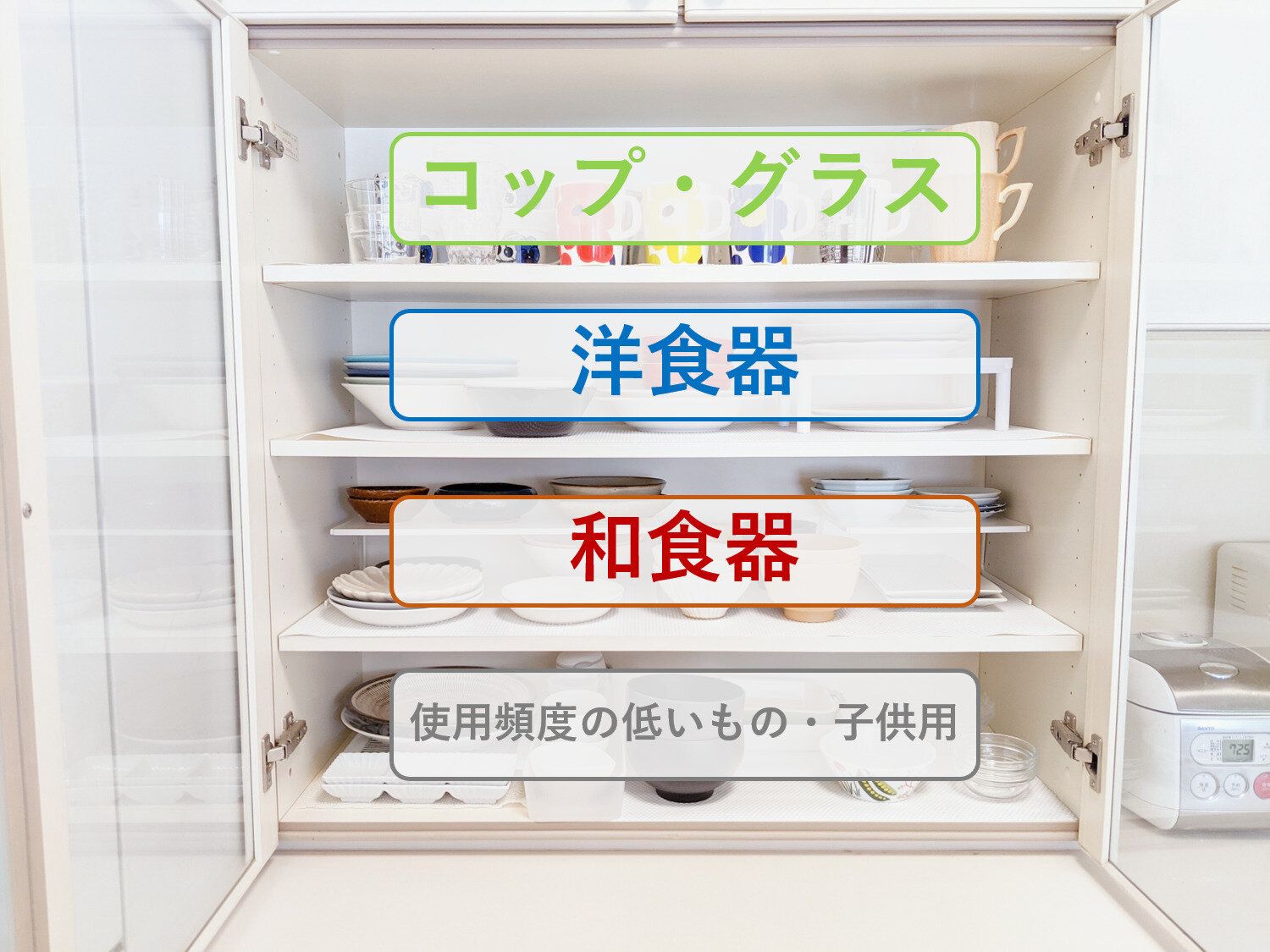 わが家の食器棚は4段なので、中間の最も出し入れがしやすい場所に洋食器と和食器を、上段にはマグカップやガラスのコップ類、下段に使用頻度が少し下がるものを収納しています。