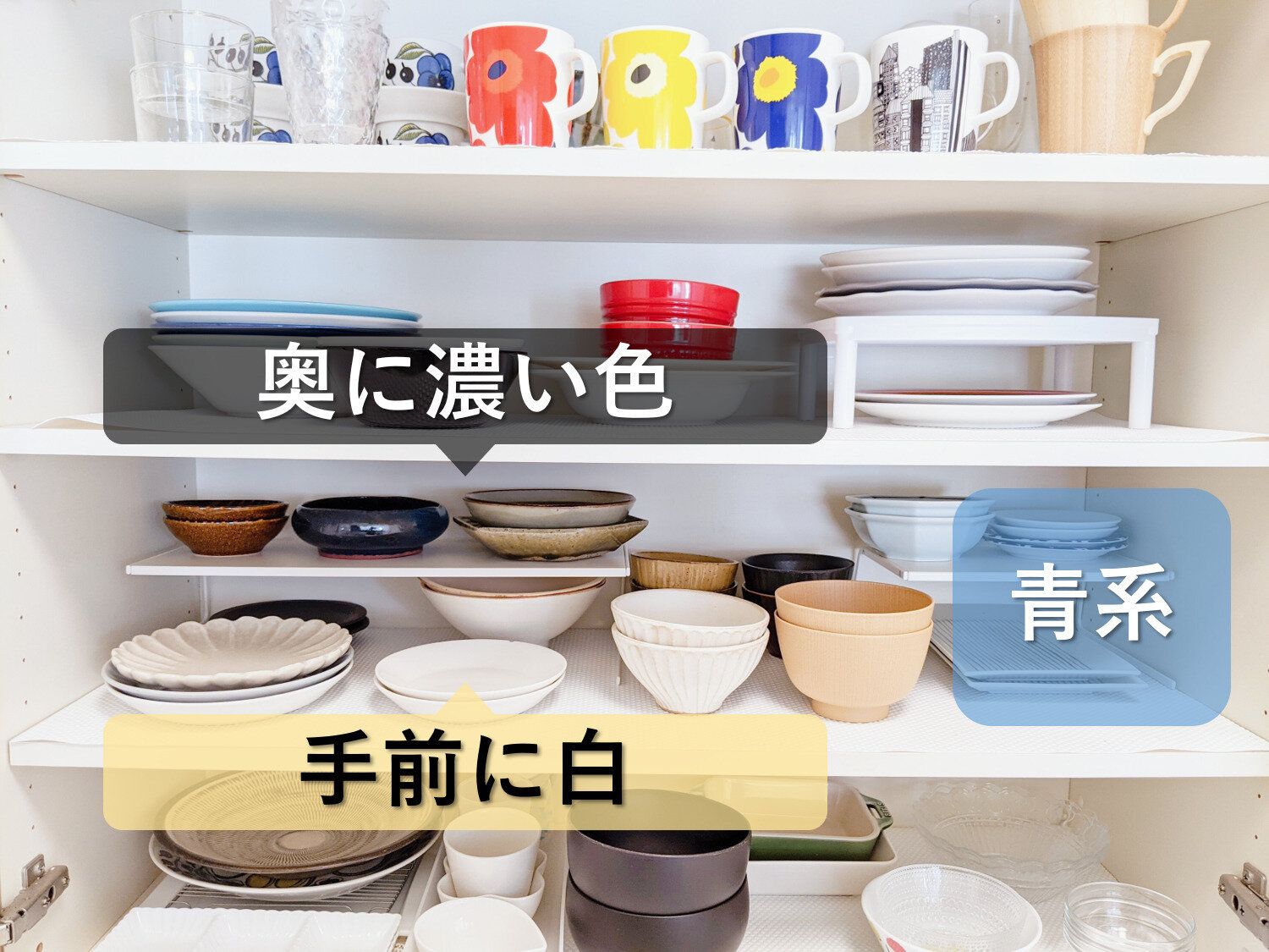 手持ちの食器の色がバラバラで統一感がない場合でも、白・黒・茶系・青系などなるべく同系色で近い位置に配置することでスッキリとします。