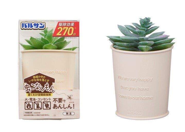 火も電池もコンセントも不要の虫よけ剤。安心・手軽に使え、虫が飛んできたり、潜んでいそうな場所に置いておくだけで、虫よけや駆除効果を発揮。インテリアになじむかわいいデザインなので、雑貨感覚で玄関に置いておけるのが魅力。効果は約270日間と長く、QRコードから登録すると交換時期を自動でお知らせしてくれるのもうれしい。