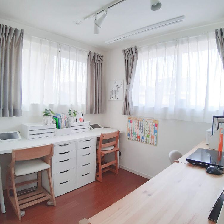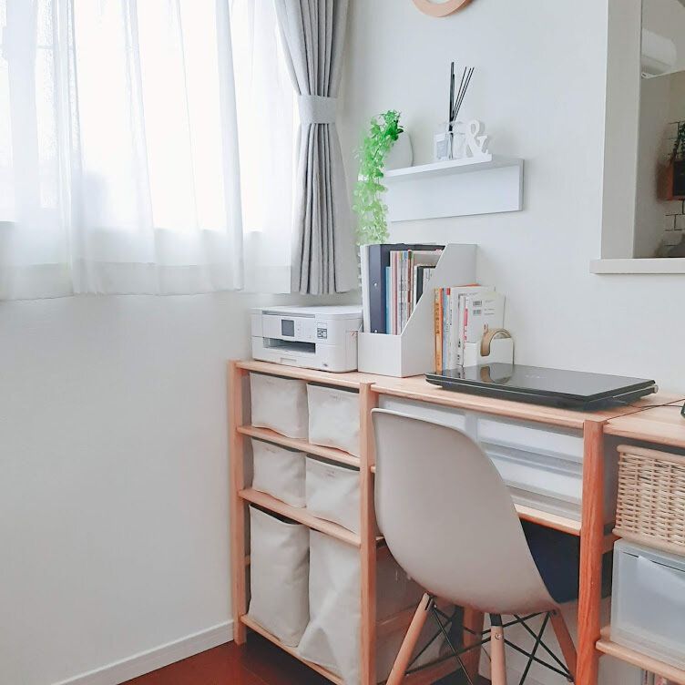 背後には無印良品のパイン材ユニットシェルフを連結して夫と私のワークスペースを作っています。パソコンで作業をしたり、仕事をしたりしています。学習ドリルなどを印刷して後ろにいる子ども達にすぐに渡すことも出来ますよ。