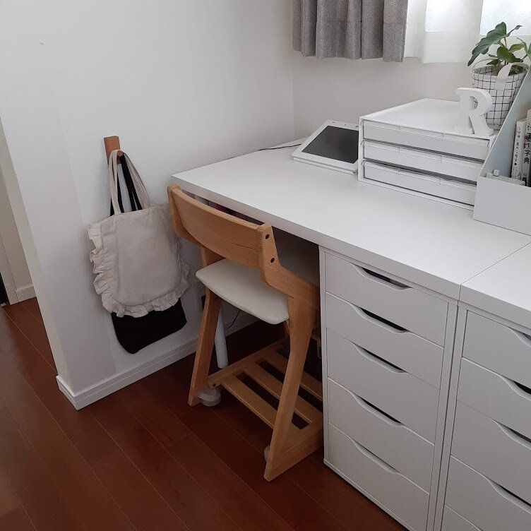 子ども達はダイニング学習派。ダイニングテーブルがあった時はテーブルの上はいつも小学生2人の学用品でいっぱい。近くに収納を設けて片付けはしていたものの、食事のタイミングで毎回リセットするのは正直面倒でした。それに毎回消しゴムのかすとの戦い…。