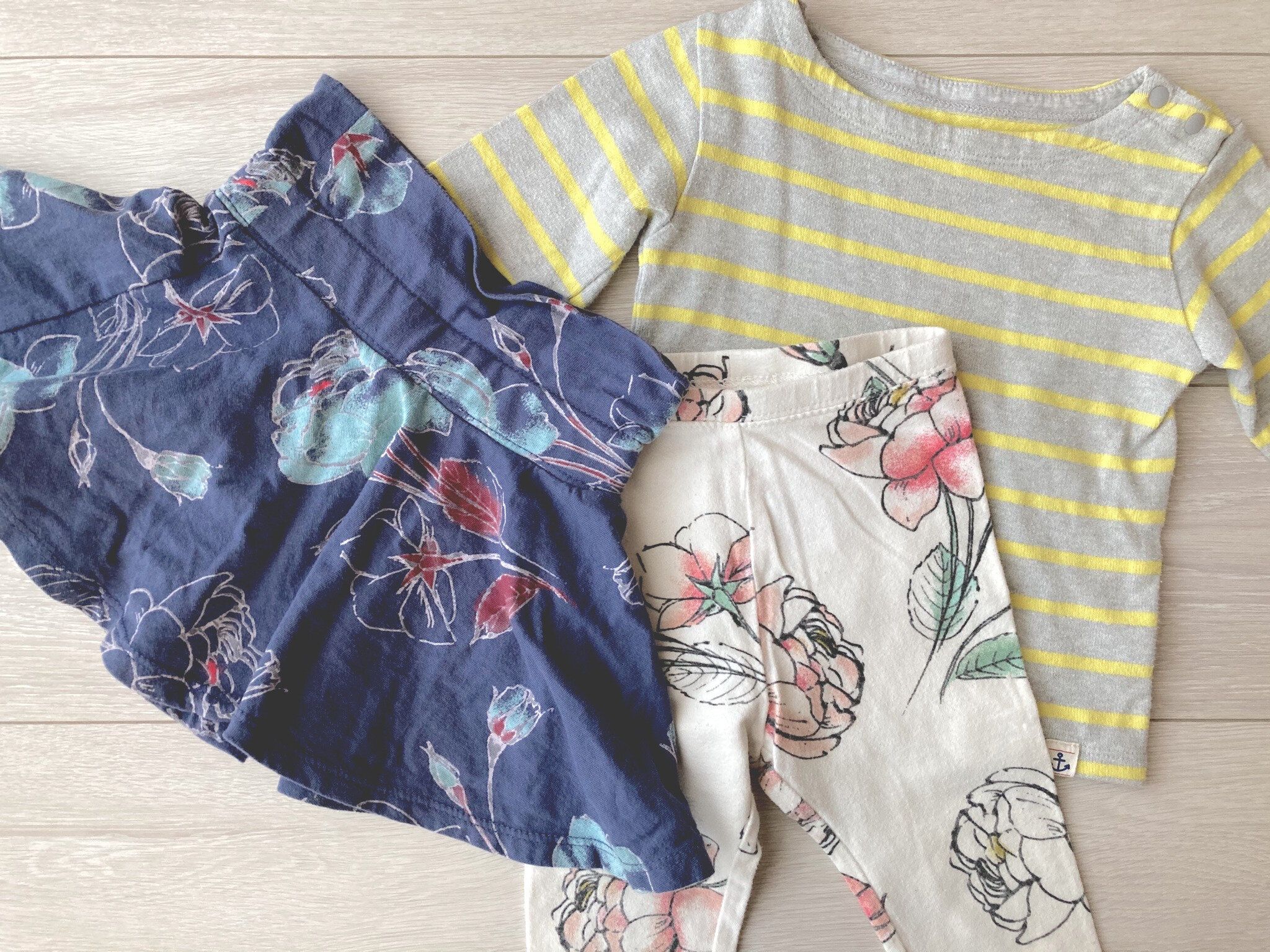 ボーダー好きな姉と、柄物好きな親戚からもらったおさがり。単体で見るとかわいいのですが、無地の服が意外と少なく合わせにくい…。