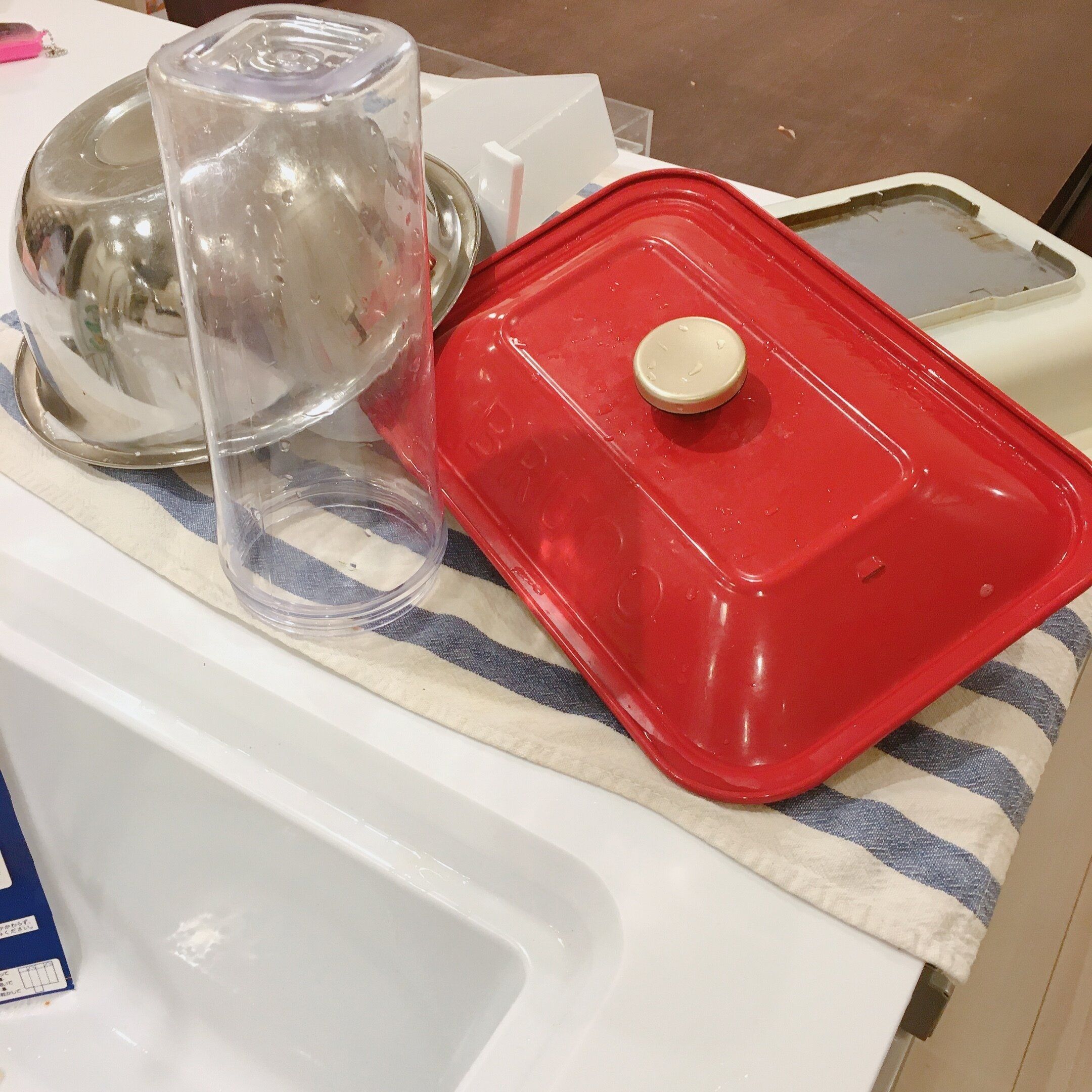 事前にお湯につけて汚れを軽く落としているので食洗機にもそのまま入れても大丈夫です。鍋類は手で洗って布巾を敷いた上にのせて乾かします。