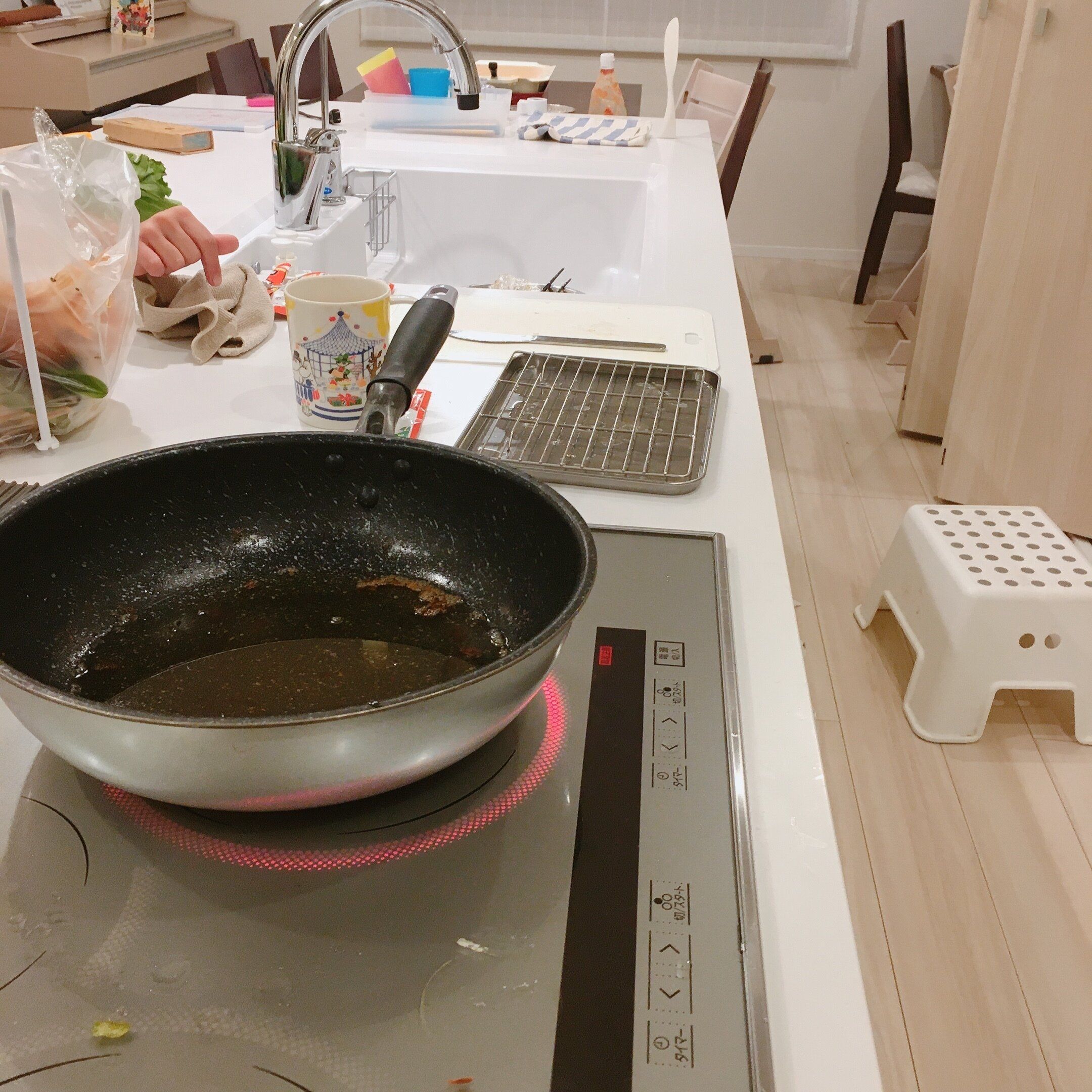 食器類を食洗機に入れて、入りきらなかった鍋やフライパンを手洗いして乾かしておきます。