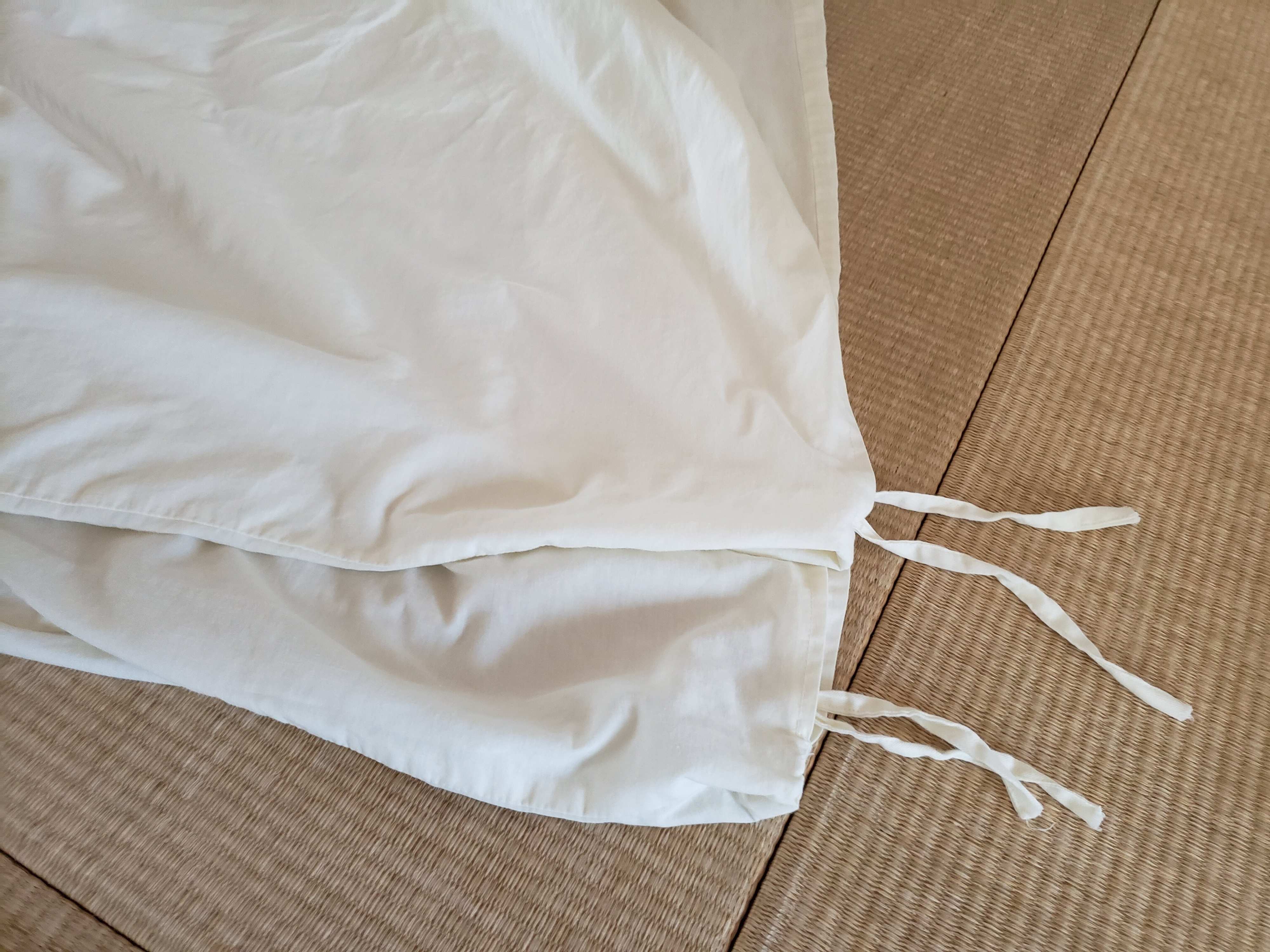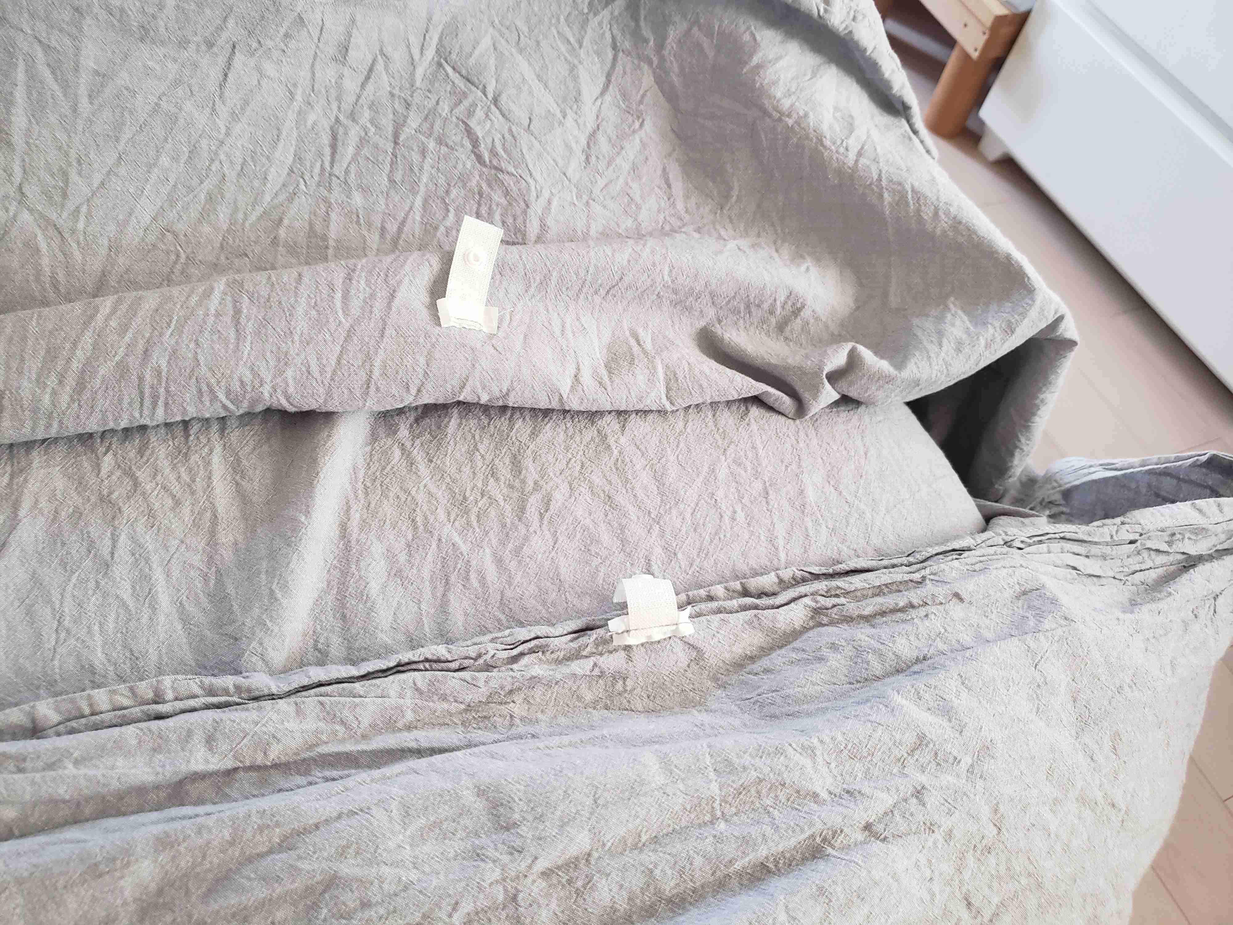 このタイプのシーツ、面倒だし時間もかかるし取りつけにくいと感じていましたが、先程のスナップボタンタイプの無印良品のものとほぼ同じくらいの取りつけ時間となりました!